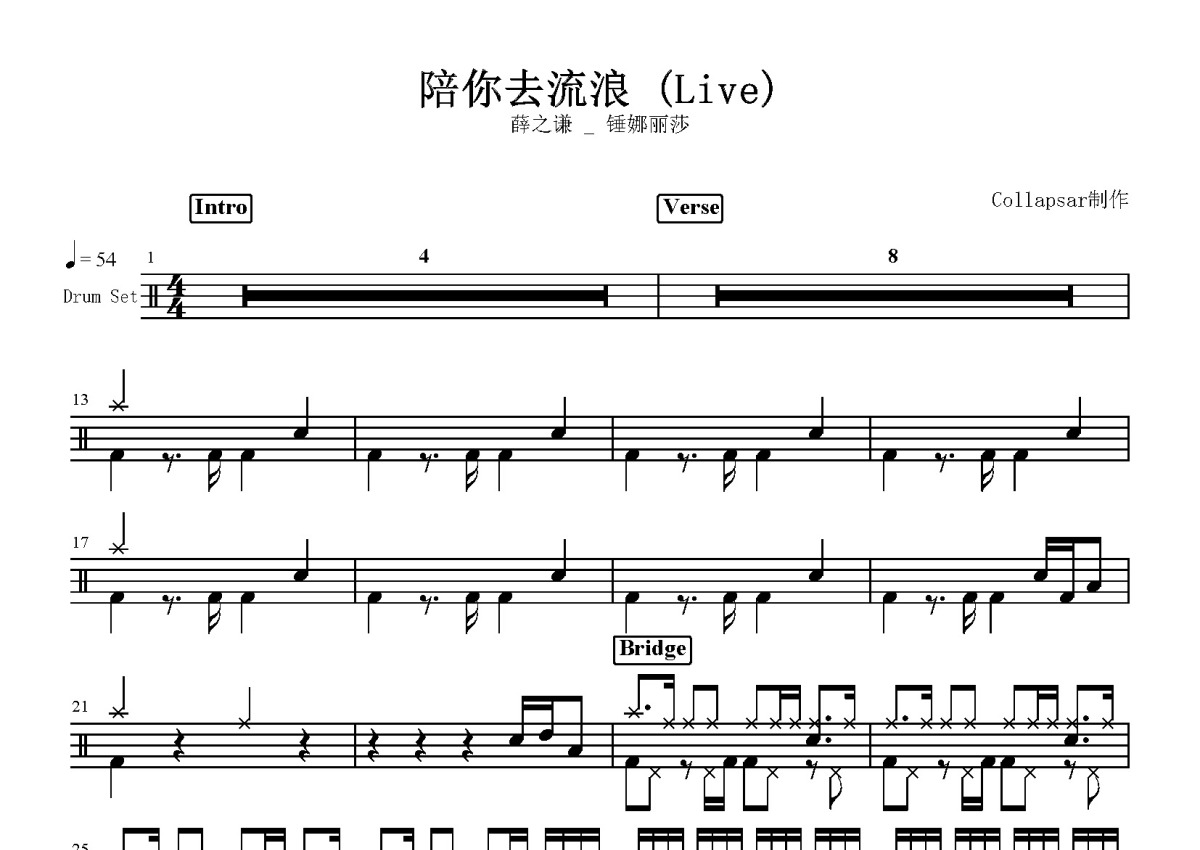 薛之谦 锤娜丽莎《陪你去流浪》鼓谱 - 架子鼓谱 - Live