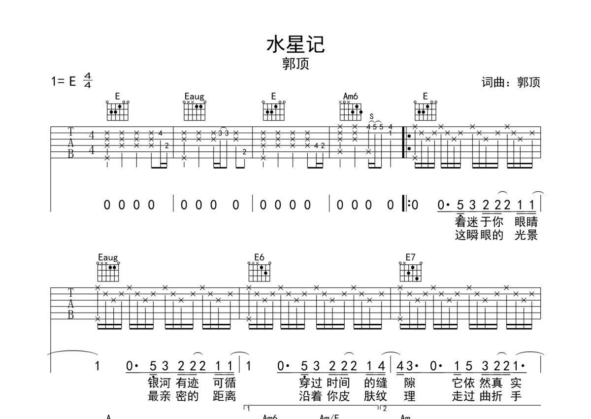郭顶《水星记》吉他谱 - E调弹唱六线谱