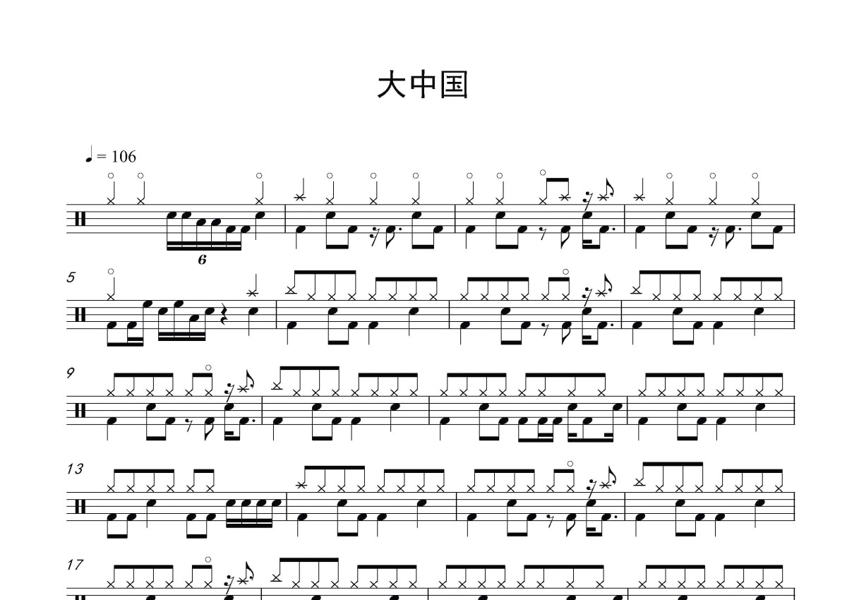 《大中国》是高枫演唱的一首歌曲,这份鼓谱共有两张高清图谱,图谱由 @打鼓谱 编配上传,图谱使用五线谱编配,使用这份大中国架子鼓谱,你将能够轻松地敲打出这首高枫的大中国,快来尝试吧。《大中国》(原名《中国》)是内地原创音乐人高枫唱作录制于1994年的一首爱国歌曲,收录于1995年6月23日发行的专辑《天那边的爱》中。1995年中央电视台《东方时空》音乐电视改版,推出后在全国引起热烈反响。1995年,该歌曲获得中央电视台MTV大赛金奖,2013年,获得第三届二十年至尊金曲。1996年央视春节联欢晚会上,高枫在节目《'95 流行风》中演唱了《中国》。1998年春晚时改名为《大中国》。该曲歌词融合了全国各地民谣的特色,是一首歌颂祖国的歌曲。 高枫(1968年7月24日~2002年9月19日。