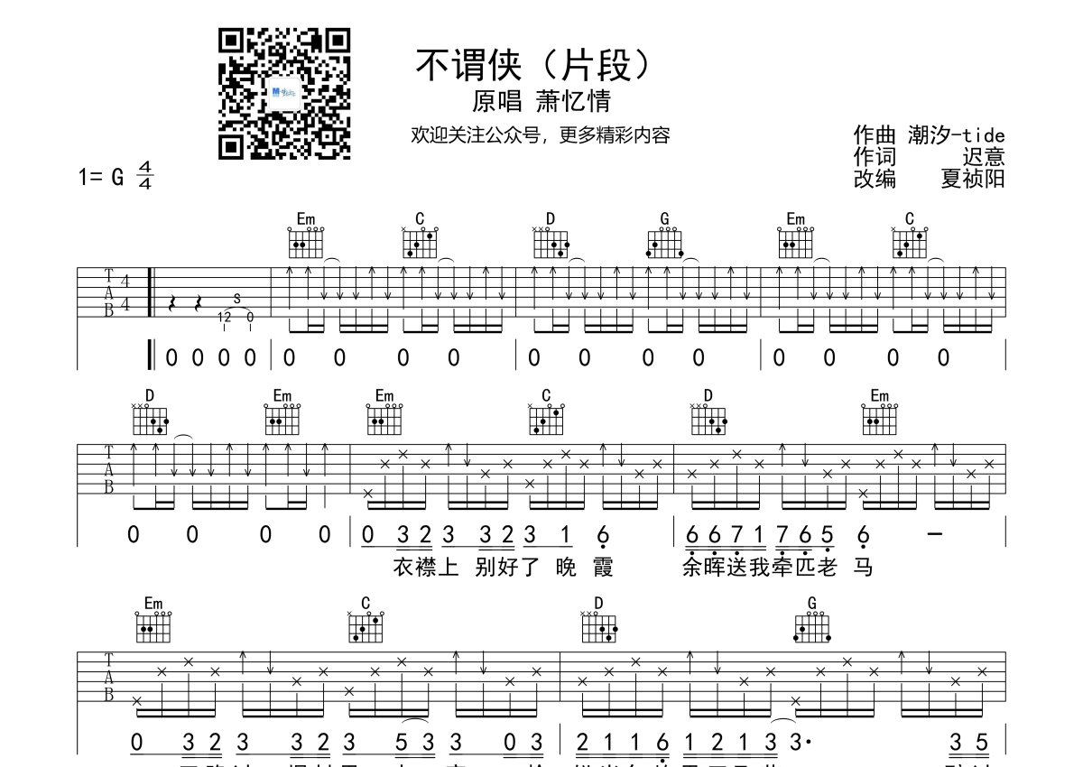 萧忆情《不谓侠》吉他谱 - G调弹唱六线谱