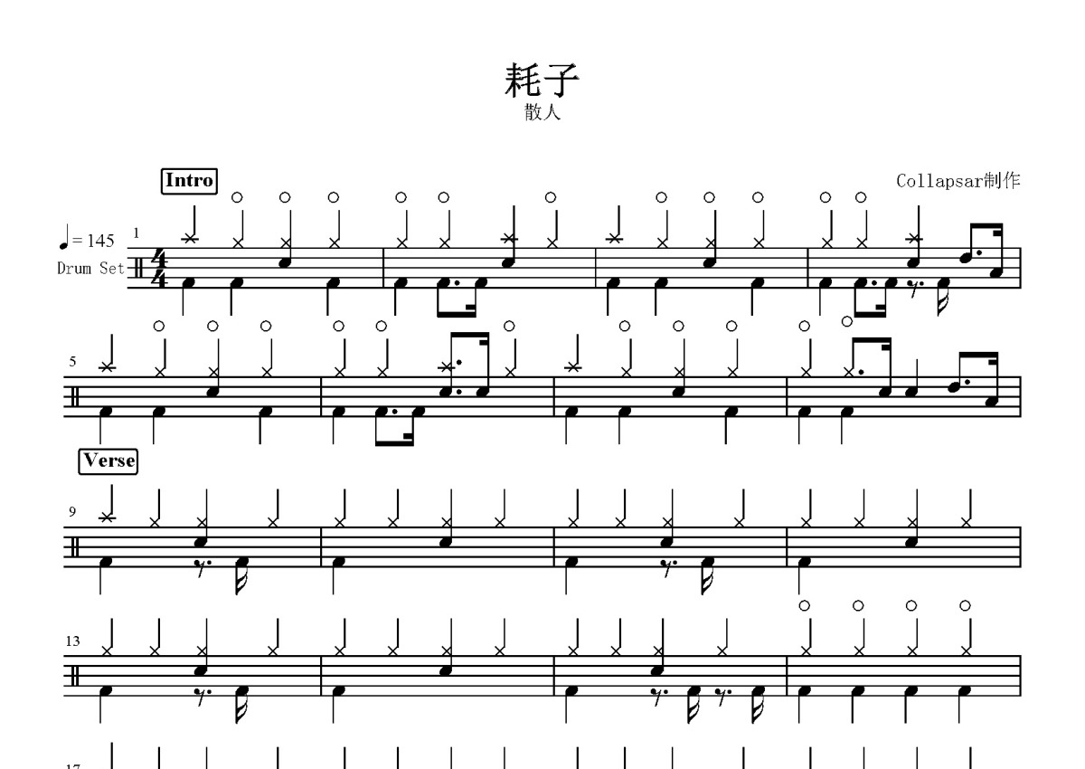 《耗子》是散人演唱的一首歌曲,这份鼓谱共有四张高清图谱,图谱由 @打鼓谱 编配上传,图谱使用五线谱编配,使用这份耗子架子鼓谱,你将能够轻松地敲打出这首散人的耗子,快来尝试吧。散人 - 耗子。