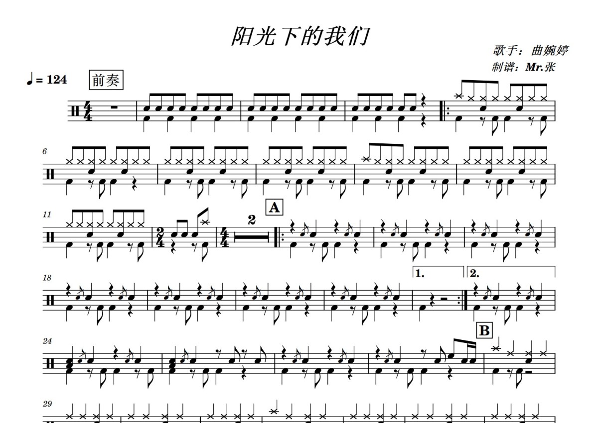 曲婉婷《阳光下的我们》鼓谱 - 架子鼓谱