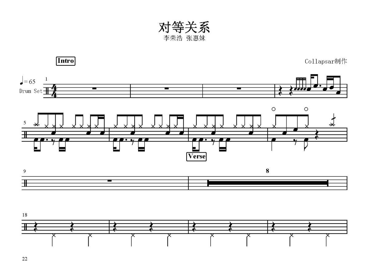 《对等关系》是李荣浩、张惠妹演唱的一首歌曲,这份鼓谱共有三张高清图谱,图谱由 @打鼓谱 编配上传,图谱使用五线谱编配,使用这份对等关系架子鼓谱,你将能够轻松地敲打出这首李荣浩、张惠妹的对等关系,快来尝试吧。《对等关系》是李荣浩、张惠妹演唱的歌曲,由李荣浩作词、作曲、编曲、制作。