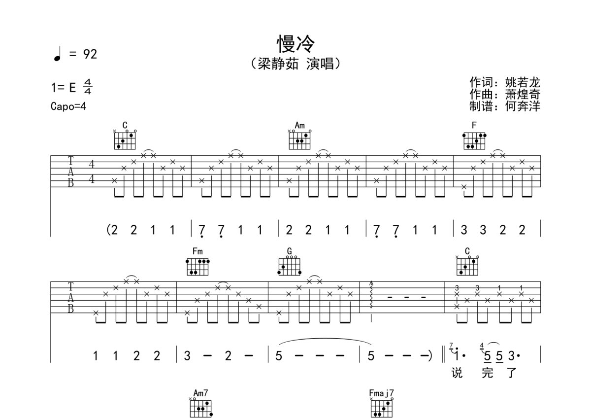 《慢冷》是梁静茹演唱的一首歌曲,本吉他谱采用的是C调指法编配,这份吉他谱共有四张高清图谱,图谱由 @何奔洋 编配上传,图谱使用六线谱编配,包含吉他和弦指法、简谱以及歌词部分,使用这份慢冷吉他谱,可以让你更加方便地掌握这首歌曲的弹唱技巧,快来尝试吧。按原版完整编配,不删任何小节。