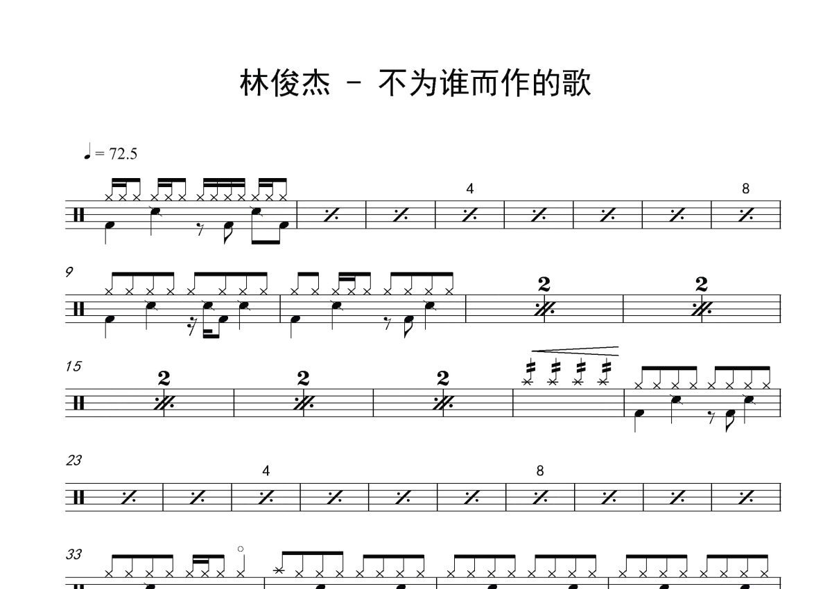 《不为谁而作的歌》是林俊杰演唱的一首歌曲,这份鼓谱共有两张高清图谱,图谱由 @打鼓谱 编配上传,图谱使用五线谱编配,使用这份不为谁而作的歌架子鼓谱,你将能够轻松地敲打出这首林俊杰的不为谁而作的歌,快来尝试吧。《不为谁而作的歌》是林俊杰演唱的一首歌曲,由林秋离填词,林俊杰谱曲,收录在林俊杰于2015年12月25日发行的实验专辑《和自己对话》中,为该专辑的首波主打 [1] 。