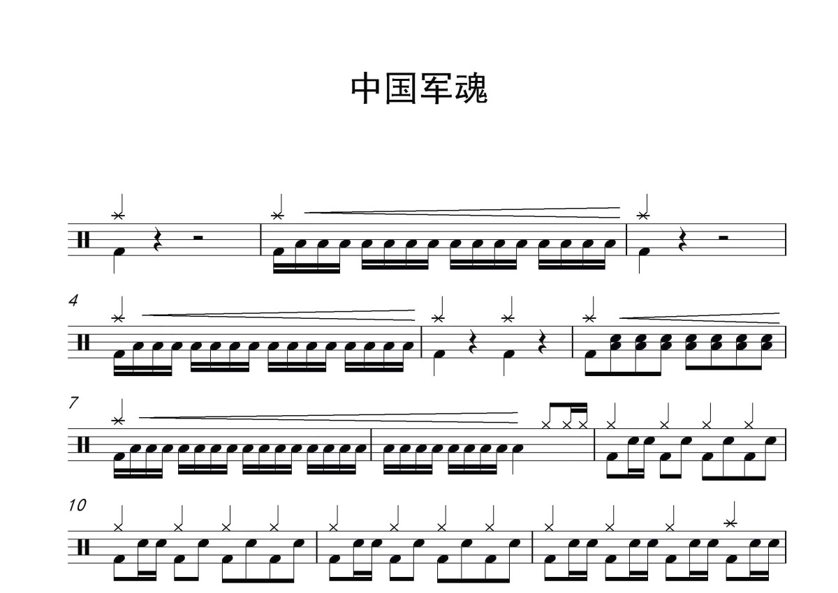《中国军魂》是北京室内男声合唱团演唱的一首歌曲,这份鼓谱共有两张高清图谱,图谱由 @打鼓谱 编配上传,图谱使用五线谱编配,使用这份中国军魂架子鼓谱,你将能够轻松地敲打出这首北京室内男声合唱团的中国军魂,快来尝试吧。《中国军魂》是电视剧《亮剑》片头曲北京室内男声合唱团演唱歌曲,由李海鹰作曲、作词,发行于2005年9月12日。该曲为抗战胜利60年创作的歌曲。