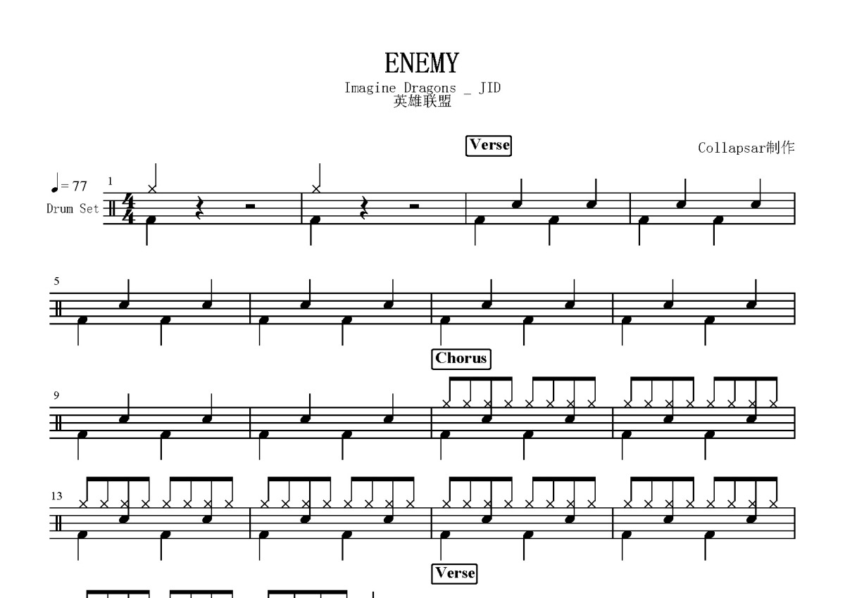 《Enemy》是Imagine Dragons/JID演唱的一首歌曲,这份鼓谱共有两张高清图谱,图谱由 @打鼓谱 编配上传,图谱使用五线谱编配,使用这份Enemy架子鼓谱,你将能够轻松地敲打出这首Imagine Dragons/JID的Enemy,快来尝试吧。美国摇滚人气天团“梦龙”Imagine Dragons联手实力说唱新声JID,献唱英雄联盟首部动画剧集《英雄联盟:双城之战》全球主题曲《Enemy》(宿敌)。