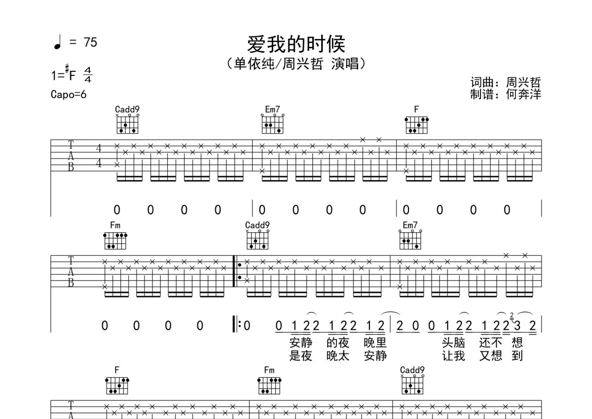 《爱我的时候》是周兴哲演唱的一首歌曲,本吉他谱采用的是C调指法编配,这份吉他谱共有三张高清图谱,图谱由 @何奔洋 编配上传,图谱使用六线谱编配,包含吉他和弦指法、简谱以及歌词部分,使用这份爱我的时候吉他谱,可以让你更加方便地掌握这首歌曲的弹唱技巧,快来尝试吧。按原版完整编配,不删任何小节。
