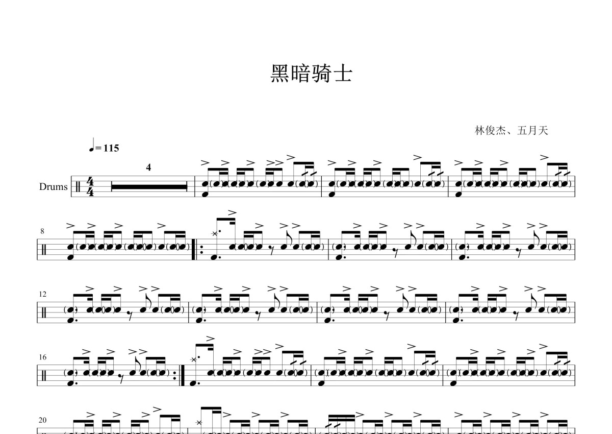 《黑暗骑士》是五月天演唱的一首歌曲,这份鼓谱共有三张高清图谱,图谱由 @打鼓谱 编配上传,图谱使用五线谱编配,使用这份黑暗骑士架子鼓谱,你将能够轻松地敲打出这首五月天的黑暗骑士,快来尝试吧。《黑暗骑士》是林俊杰与五月天合作的一首单曲,由陈信宏填词、林俊杰谱曲、林俊杰、陈信宏演唱,收录于林俊杰2013年3月13日发行的专辑《因你而在》中 [1-2] ,是林俊杰和陈信宏合作的“黑色三部曲”系列的第二部。