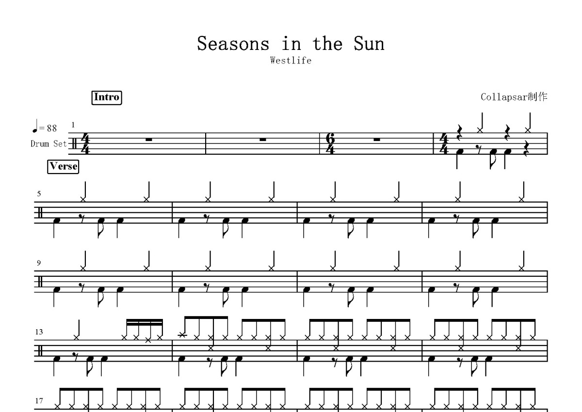 《Seasons in the Sun》是Westlife演唱的一首歌曲,这份鼓谱共有三张高清图谱,图谱由 @打鼓谱 编配上传,图谱使用五线谱编配,使用这份Seasons in the Sun架子鼓谱,你将能够轻松地敲打出这首Westlife的Seasons in the Sun,快来尝试吧。《Seasons in the Sun》(中文名:《阳光季节》)发行于1961年,原为法语歌手Jacques Brel的作品,之后被Terry Jacks和Westlife翻唱,分别发行于1974年和1999年。