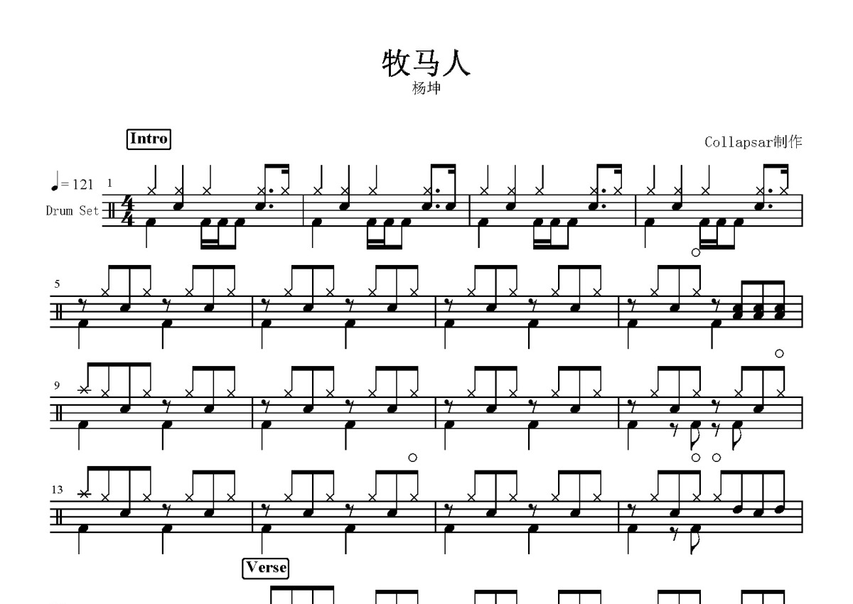 《牧马人》是杨坤演唱的一首歌曲,这份鼓谱共有四张高清图谱,图谱由 @打鼓谱 编配上传,图谱使用五线谱编配,使用这份牧马人架子鼓谱,你将能够轻松地敲打出这首杨坤的牧马人,快来尝试吧。《牧马人》是是中国创造歌手杨坤演唱的一首歌,由文雅填词,杨坤谱曲,歌曲MV由TOM执导,收录在杨坤2007年4月22日发行的同名专辑《牧马人》中。