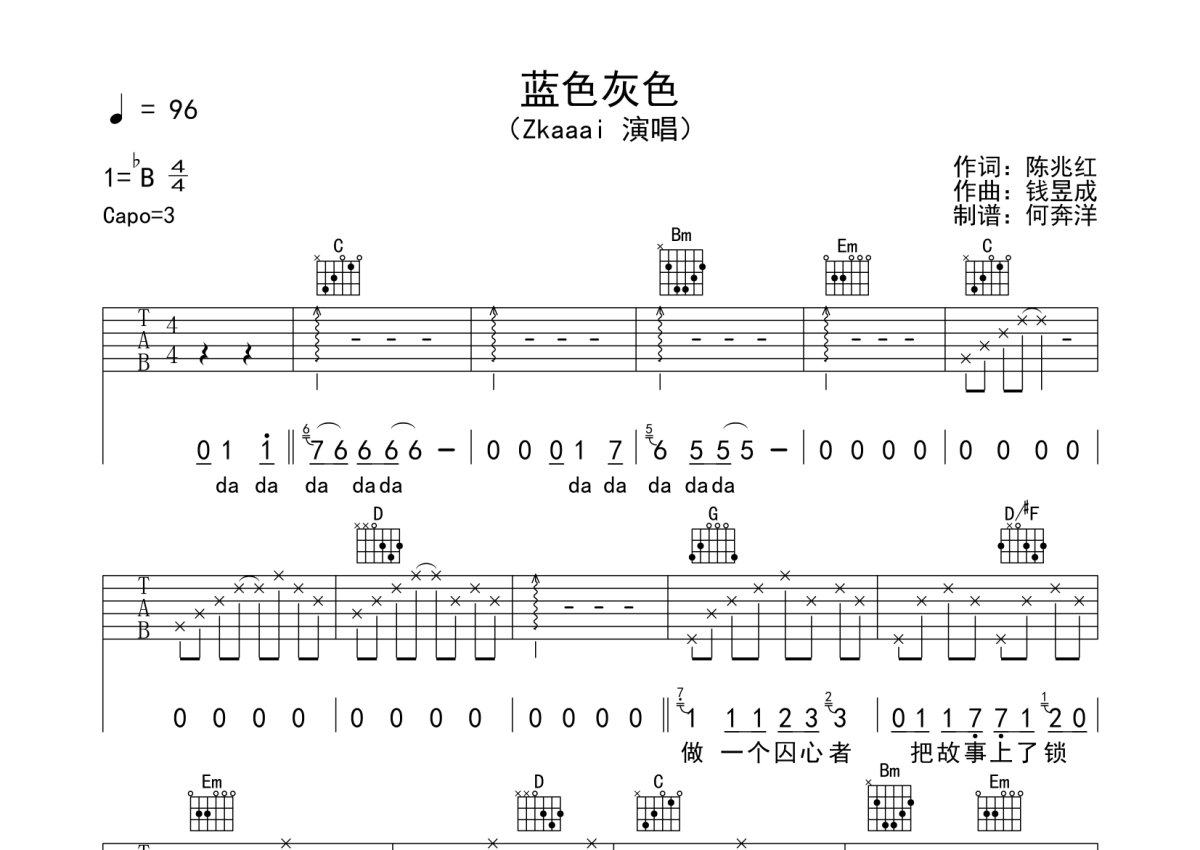 Zkaaai《蓝色灰色》吉他谱 - G调弹唱六线谱