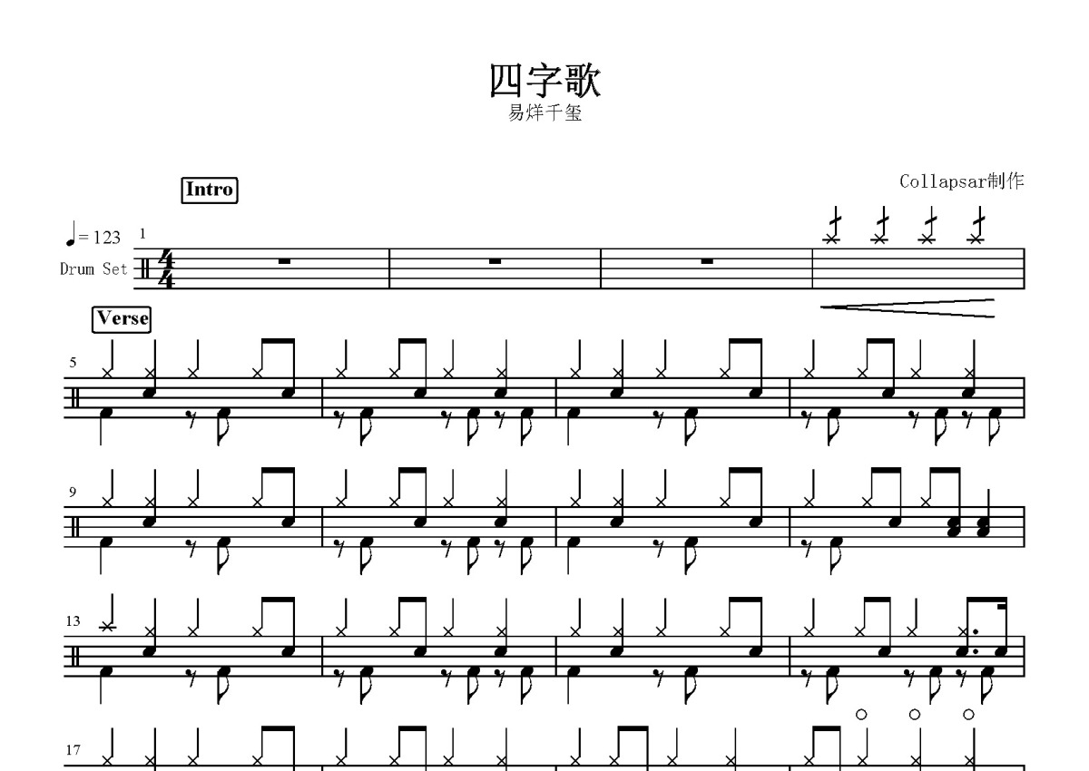 《四字歌》是易烊千玺演唱的一首歌曲,这份鼓谱共有三张高清图谱,图谱由 @打鼓谱 编配上传,图谱使用五线谱编配,使用这份四字歌架子鼓谱,你将能够轻松地敲打出这首易烊千玺的四字歌,快来尝试吧。《四字歌》是江湖神经作词,夏日入侵企画作曲,易烊千玺演唱的歌曲,发行于2021年11月28日,收录于同名专辑《四字歌》中。