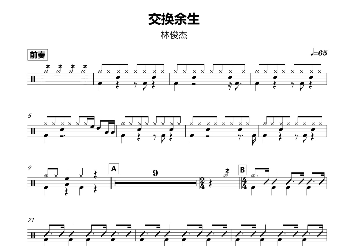 《交换余生》是林俊杰演唱的一首歌曲,这份鼓谱共有两张高清图谱,图谱由 @打鼓谱 编配上传,图谱使用五线谱编配,使用这份交换余生架子鼓谱,你将能够轻松地敲打出这首林俊杰的交换余生,快来尝试吧。《交换余生》是林俊杰演唱的歌曲,由易家扬作词,林俊杰作曲,收录于林俊杰2020年发行的音乐EP《幸存者》。2020年,林俊杰凭借该曲入围亚洲流行音乐大奖“最佳华语作曲人奖”。