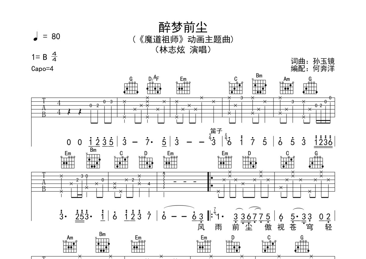 林志炫《醉梦前尘》吉他谱 - G调弹唱六线谱