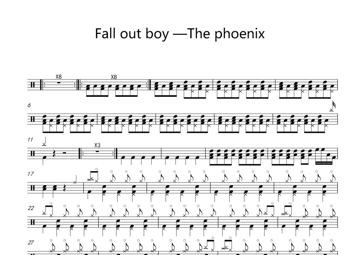 《The phoenix》是Fall out boy 演唱的一首歌曲,这份鼓谱共有两张高清图谱,图谱由 @打鼓谱 编配上传,图谱使用五线谱编配,使用这份The phoenix架子鼓谱,你将能够轻松地敲打出这首Fall out boy 的The phoenix,快来尝试吧。《The Phoenix》是美国摇滚乐队Fall out boy演唱的歌曲,由帕特里克·斯特普、皮特·温兹、乔·特洛曼、安迪·赫里作词作曲,收录在打倒男孩第五张录音室专辑《Save Rock and Roll》中,于2013年7月16日作为专辑的第二支单曲发布。