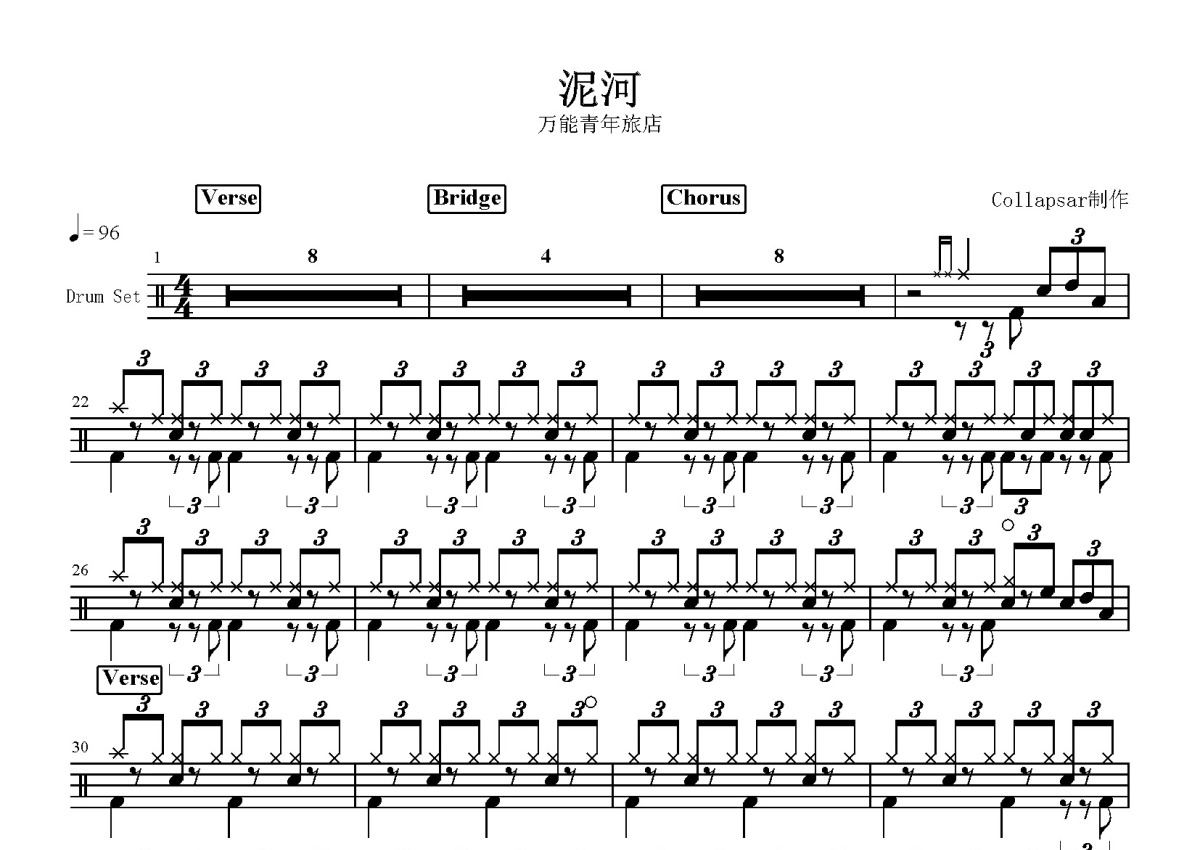万能青年旅店《泥河》鼓谱 - 架子鼓谱