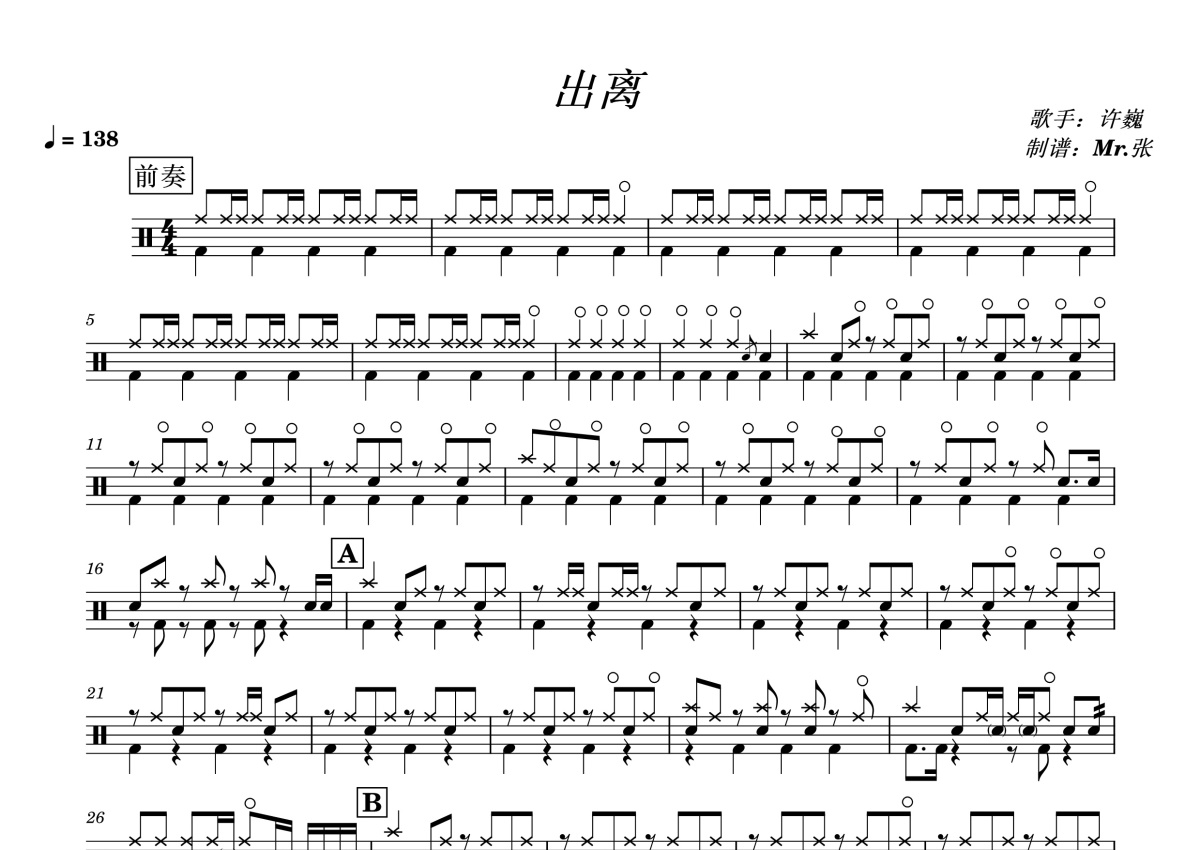 《出离》是许巍演唱的一首歌曲,这份鼓谱共有两张高清图谱,图谱由 @打鼓谱 编配上传,图谱使用五线谱编配,使用这份出离架子鼓谱,你将能够轻松地敲打出这首许巍的出离,快来尝试吧。《出离》为许巍的原创歌曲,收录在专辑《此时此刻》中。