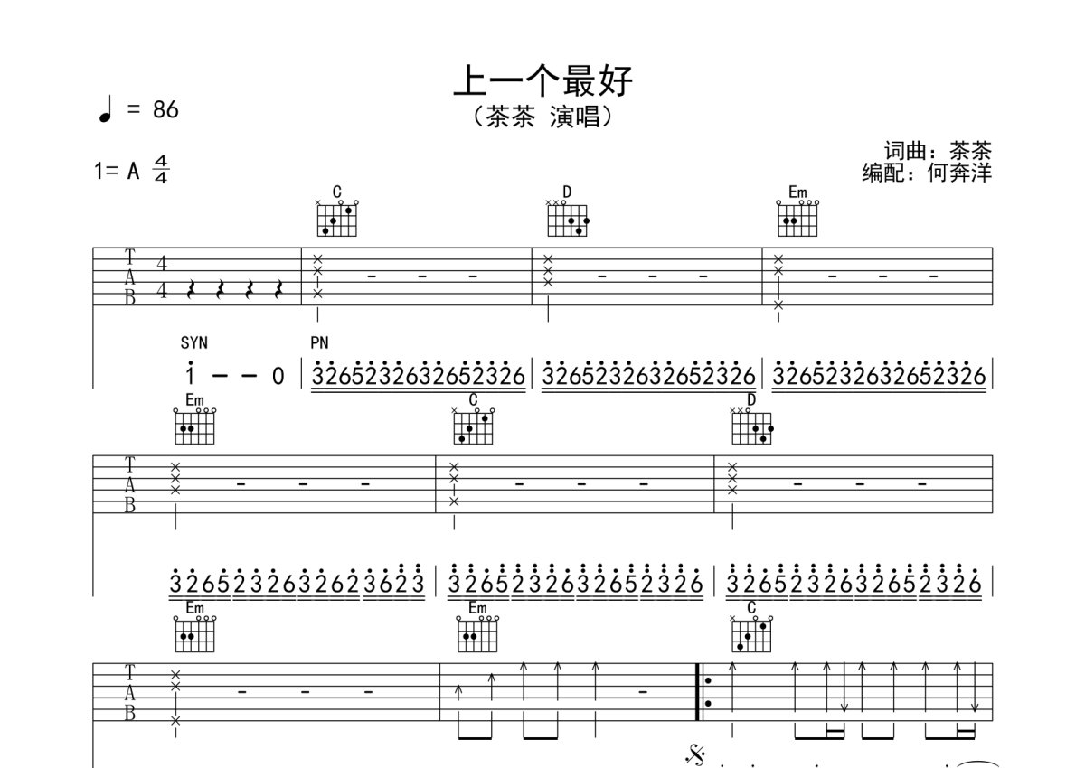 《上一个最好》是茶茶演唱的一首歌曲,本吉他谱采用的是G调指法编配,这份吉他谱共有三张高清图谱,图谱由 @何奔洋 编配上传,图谱使用六线谱编配,包含吉他和弦指法、简谱以及歌词部分,使用这份上一个最好吉他谱,可以让你更加方便地掌握这首歌曲的弹唱技巧,快来尝试吧。按原版完整编配,不删任何小节。