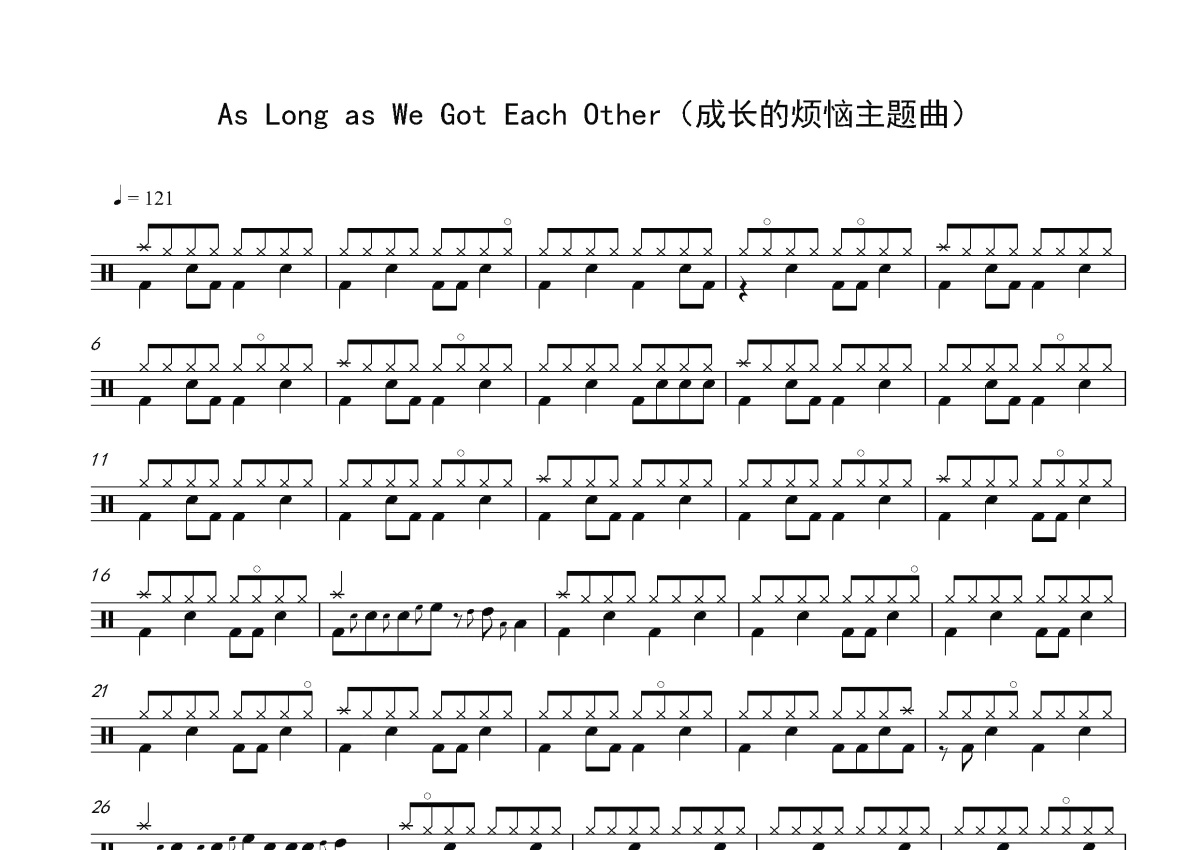 《As Long as We Got Each Other》是B.j. Thomas演唱的一首歌曲,这份鼓谱共有两张高清图谱,图谱由 @打鼓谱 编配上传,图谱使用五线谱编配,使用这份As Long as We Got Each Other架子鼓谱,你将能够轻松地敲打出这首B.j. Thomas的As Long as We Got Each Other,快来尝试吧。