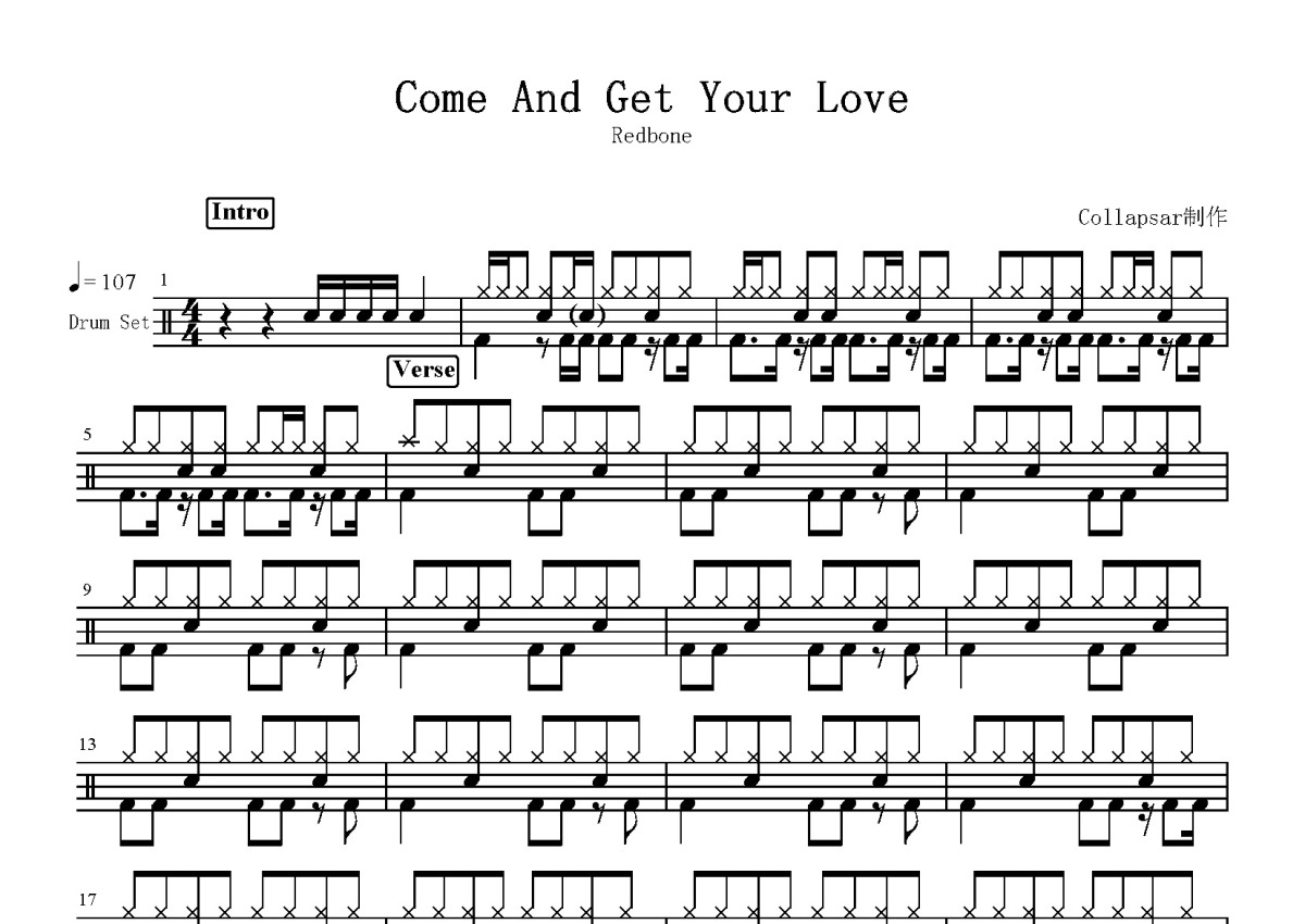 《Come and Get Your Love》是Redbone演唱的一首歌曲,这份鼓谱共有三张高清图谱,图谱由 @打鼓谱 编配上传,图谱使用五线谱编配,使用这份Come and Get Your Love架子鼓谱,你将能够轻松地敲打出这首Redbone的Come and Get Your Love,快来尝试吧。《Come and Get Your Love》是由美国摇滚乐队Redbone(红骨头乐队)演唱的一首歌曲,出自乐队专辑《Wovoka》,同时也是电影《银河护卫队》的插曲。