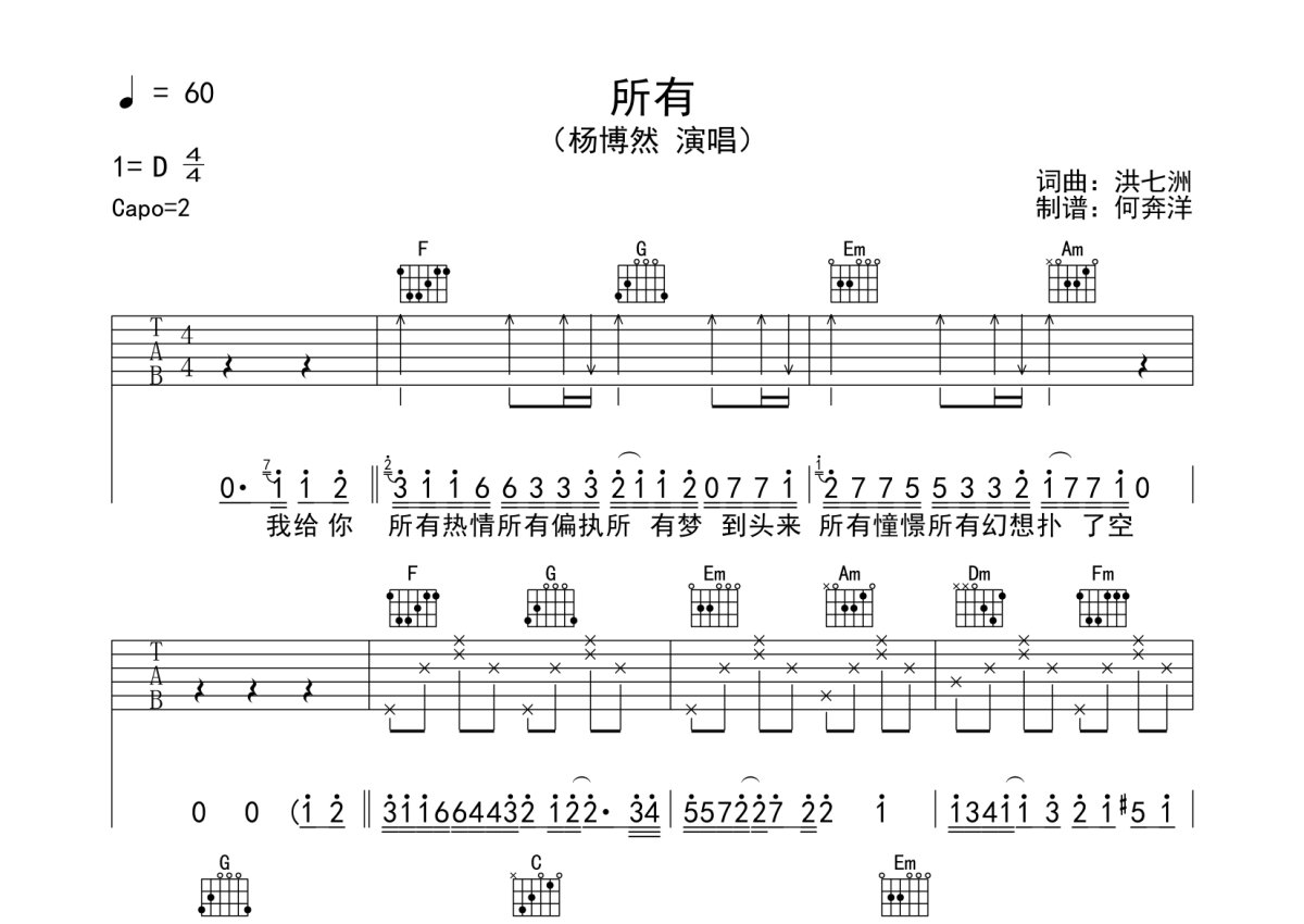杨博然《所有》吉他谱 - C调弹唱六线谱
