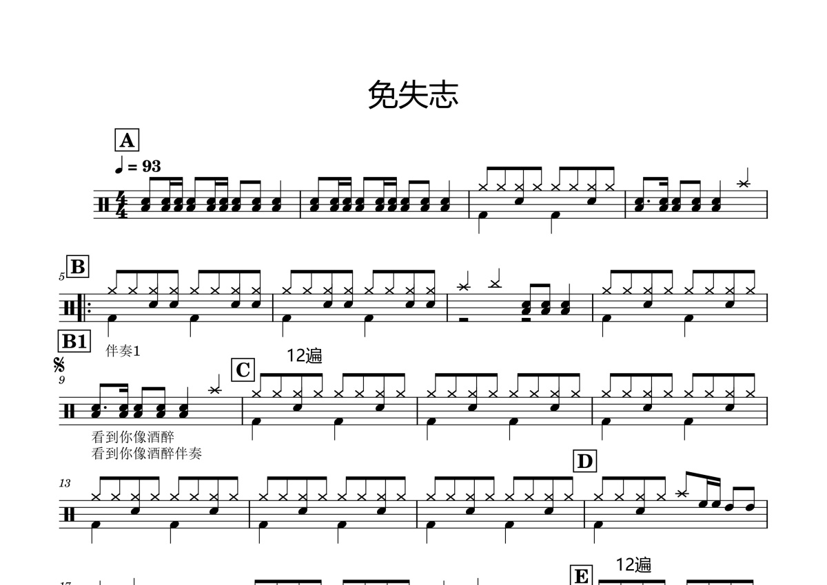 《免失志》是卓依婷演唱的一首歌曲,这份鼓谱共有一张高清图谱,图谱由 @打鼓谱 编配上传,图谱使用五线谱编配,使用这份免失志架子鼓谱,你将能够轻松地敲打出这首卓依婷的免失志,快来尝试吧。《免失志》是由卓依婷演唱的歌曲,收录在卓依婷1995年发行专辑《闽南语情歌大对唱》中。此歌为闽南语歌曲,歌名的意思是不要失去志气。