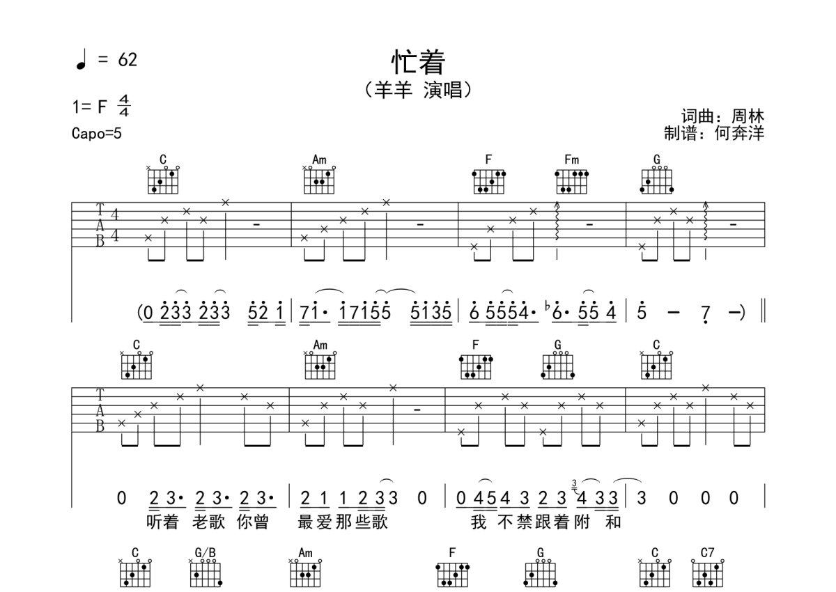羊羊《忙着》吉他谱 - C调弹唱六线谱 - 原版完整编配