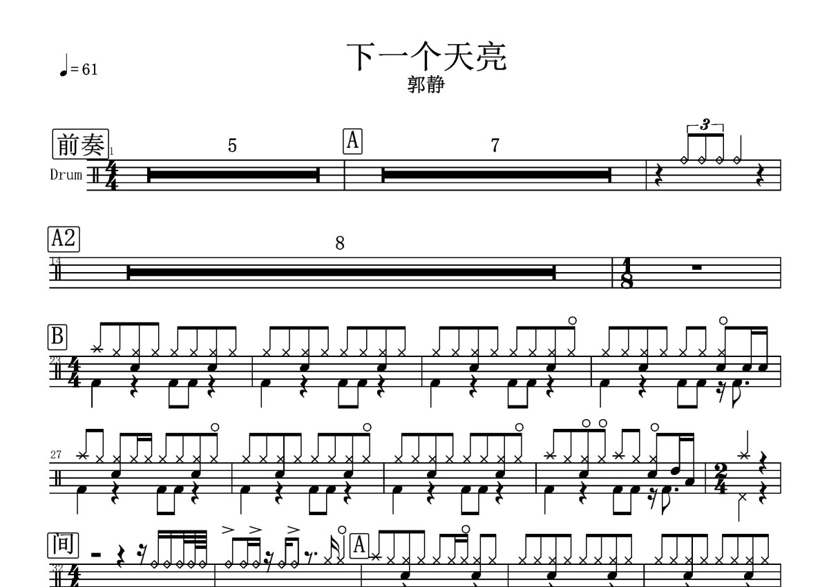 《下一个天亮》是郭静演唱的一首歌曲,这份鼓谱共有两张高清图谱,图谱由 @打鼓谱 编配上传,图谱使用五线谱编配,使用这份下一个天亮架子鼓谱,你将能够轻松地敲打出这首郭静的下一个天亮,快来尝试吧。《下一个天亮》是中国台湾女歌手郭静演唱的一首歌曲,亦是其成名作,由陈小霞作曲,姚若龙填词,陈俊廷制作,收录于郭静2008年5月发行的同名专辑《下一个天亮》中。