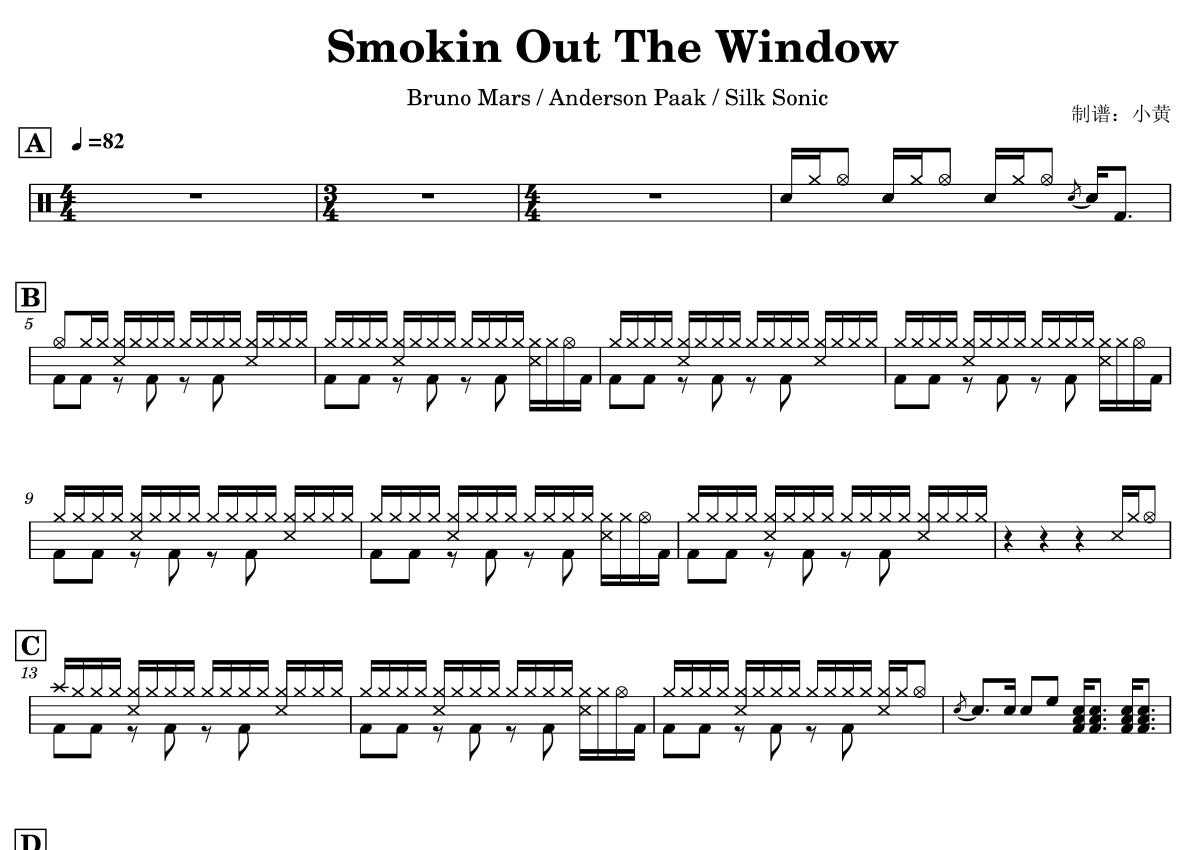 《Smokin Out The Window》是Bruno Mars / Anderson Paak / Silk Sonic演唱的一首歌曲,这份鼓谱共有两张高清图谱,图谱由 @打鼓谱 编配上传,图谱使用五线谱编配,使用这份Smokin Out The Window架子鼓谱,你将能够轻松地敲打出这首Bruno Mars / Anderson Paak / Silk Sonic的Smokin Out The Window,快来尝试吧。《Smokin Out The Window》 - Bruno Mars / Anderson Paak / Silk Sonic。