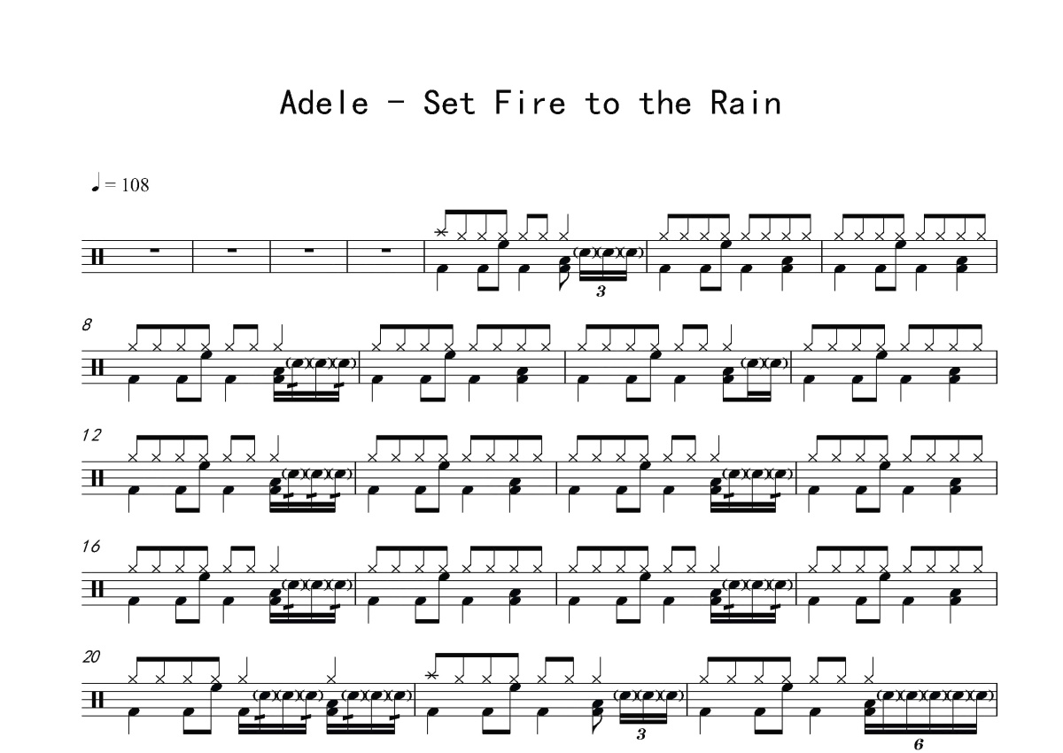 《Set Fire to the Rain》是Adele演唱的一首歌曲,这份鼓谱共有两张高清图谱,图谱由 @打鼓谱 编配上传,图谱使用五线谱编配,使用这份Set Fire to the Rain架子鼓谱,你将能够轻松地敲打出这首Adele的Set Fire to the Rain,快来尝试吧。《Set Fire to the Rain》是英国女歌手阿黛尔·阿德金斯演唱的一首流行歌曲,歌词、曲谱由阿黛尔·阿德金斯、弗雷泽·史密斯编写,弗雷泽·史密斯负责音乐制作 。该歌曲收录在阿黛尔·阿德金斯于2011年1月24日发行的第二张录音室专辑《21》,并作为推广专辑的第三支单曲,于2011年7月4日通过XL唱片公司和哥伦比亚唱片公司发行。