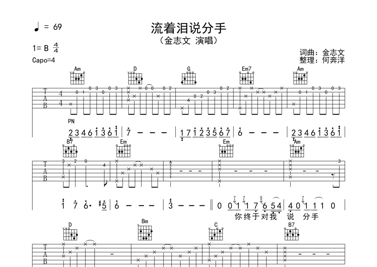 《流着泪说分手》是金志文演唱的一首歌曲,本吉他谱采用的是G调指法编配,这份吉他谱共有三张高清图谱,图谱由 @何奔洋 编配上传,图谱使用六线谱编配,包含吉他和弦指法、简谱以及歌词部分,使用这份流着泪说分手吉他谱,可以让你更加方便地掌握这首歌曲的弹唱技巧,快来尝试吧。按原版完整编配,不删任何小节。