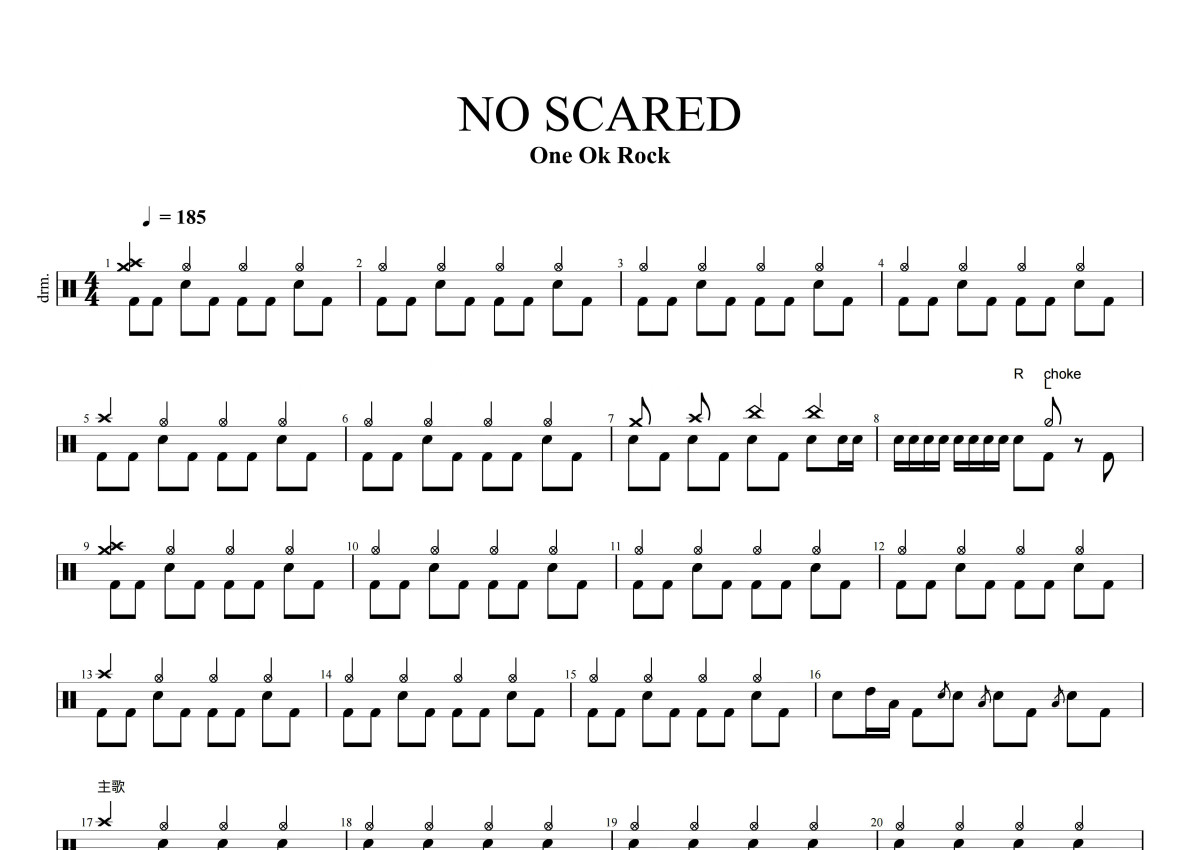 《NO SCARED》是ONE OK ROCK (ワンオクロック)演唱的一首歌曲,这份鼓谱共有四张高清图谱,图谱由 @打鼓谱 编配上传,图谱使用五线谱编配,使用这份NO SCARED架子鼓谱,你将能够轻松地敲打出这首ONE OK ROCK (ワンオクロック)的NO SCARED,快来尝试吧。《no scared》是一首由日本的四人摇滚乐队one ok rock演唱的摇滚歌曲,是日本游戏《黑岩射手:游戏版》的主题曲,同时也是英雄联盟职业联赛夏季赛的主题曲。 。