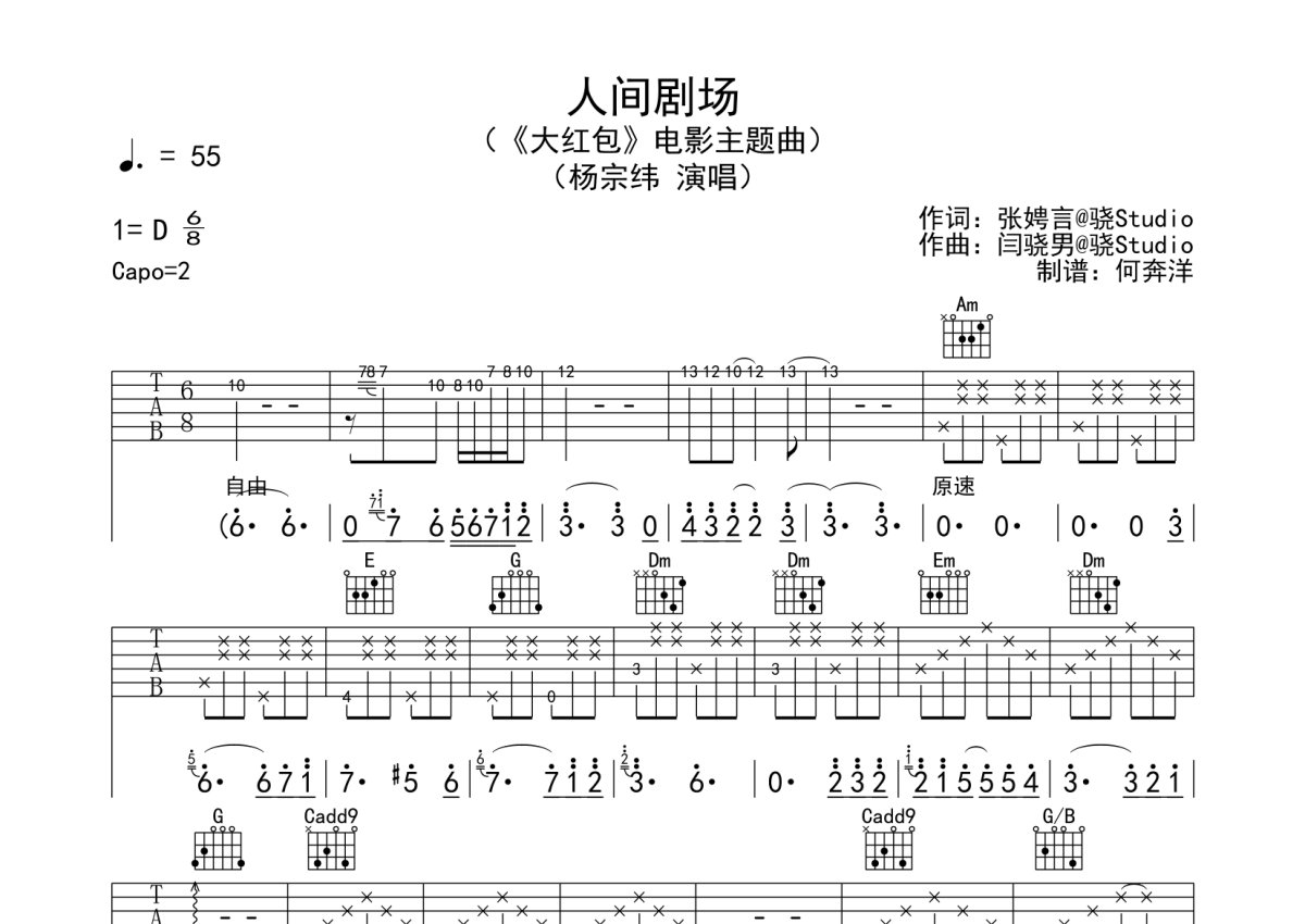 《人间剧场》是杨宗纬演唱的一首歌曲,本吉他谱采用的是C调指法编配,这份吉他谱共有三张高清图谱,图谱由 @何奔洋 编配上传,图谱使用六线谱编配,包含吉他和弦指法、简谱以及歌词部分,使用这份人间剧场吉他谱,可以让你更加方便地掌握这首歌曲的弹唱技巧,快来尝试吧。按原版完整编配,不删任何小节。