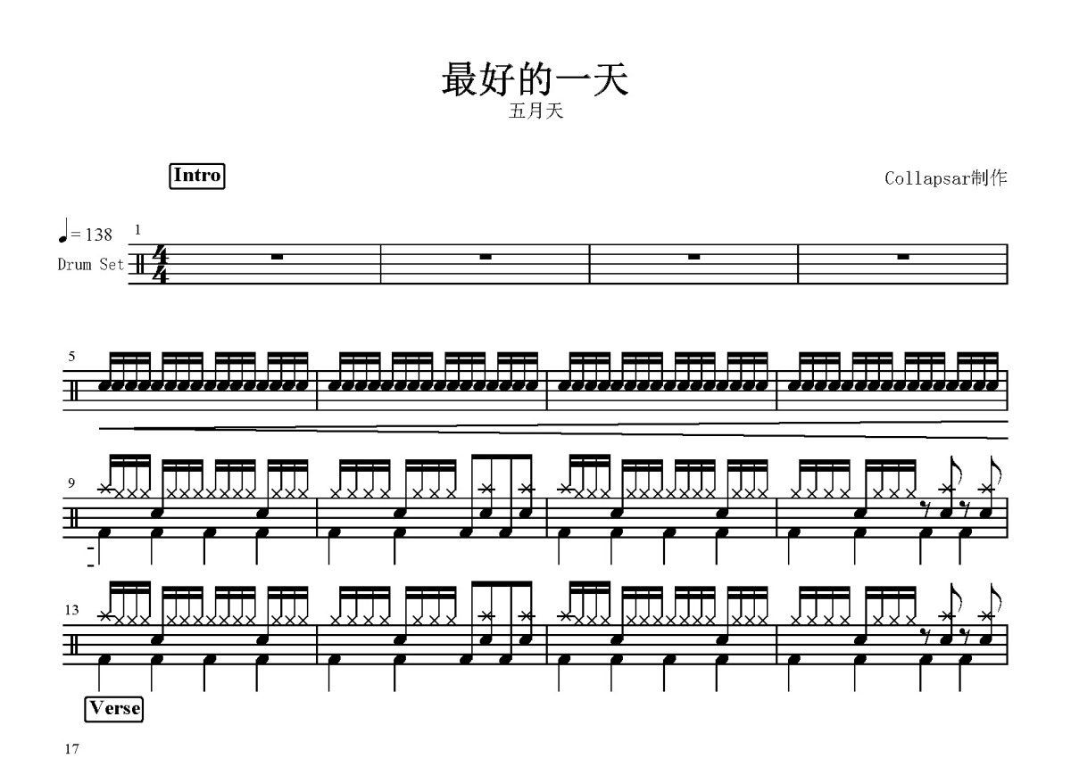 《最好的一天》是五月天演唱的一首歌曲,这份鼓谱共有四张高清图谱,图谱由 @打鼓谱 编配上传,图谱使用五线谱编配,使用这份最好的一天架子鼓谱,你将能够轻松地敲打出这首五月天的最好的一天,快来尝试吧。《最好的一天》是由阿信作词,石头作曲,五月天演唱的歌曲,收录在五月天第9张音乐专辑《自传》中。 。