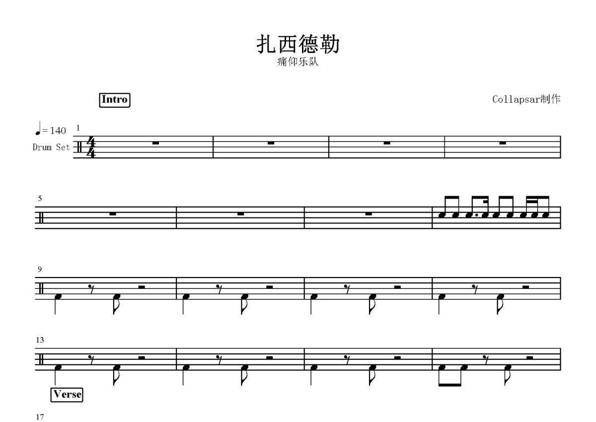 《扎西德勒》是痛仰乐队演唱的一首歌曲,这份鼓谱共有四张高清图谱,图谱由 @打鼓谱 编配上传,图谱使用五线谱编配,使用这份扎西德勒架子鼓谱,你将能够轻松地敲打出这首痛仰乐队的扎西德勒,快来尝试吧。《扎西德勒》是痛仰乐队演唱的一首歌曲。
