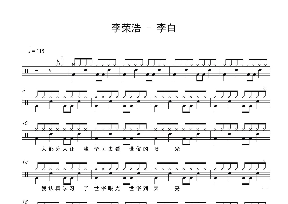 《李白》是李荣浩演唱的一首歌曲,这份鼓谱共有三张高清图谱,图谱由 @打鼓谱 编配上传,图谱使用五线谱编配,使用这份李白架子鼓谱,你将能够轻松地敲打出这首李荣浩的李白,快来尝试吧。《李白》是李荣浩作词、作曲、编曲并演唱的歌曲,收录2013年9月17日发行的原创专辑《模特》中。李荣浩(Ronghao Li),1985年7月11日出生于安徽省蚌埠市,中国内地流行乐男歌手、音乐人、演员。