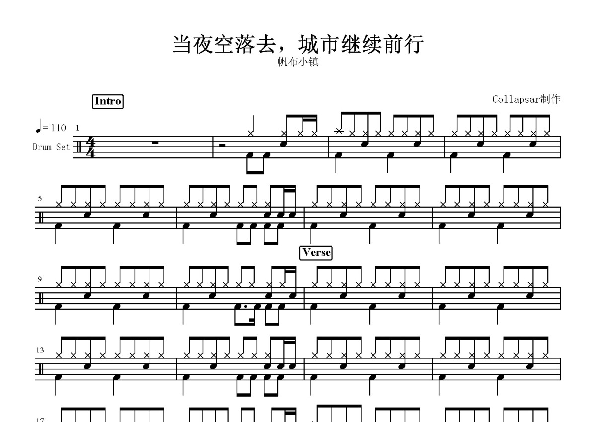 帆布小镇《当夜空落去,城市继续前行》鼓谱 - 架子鼓谱