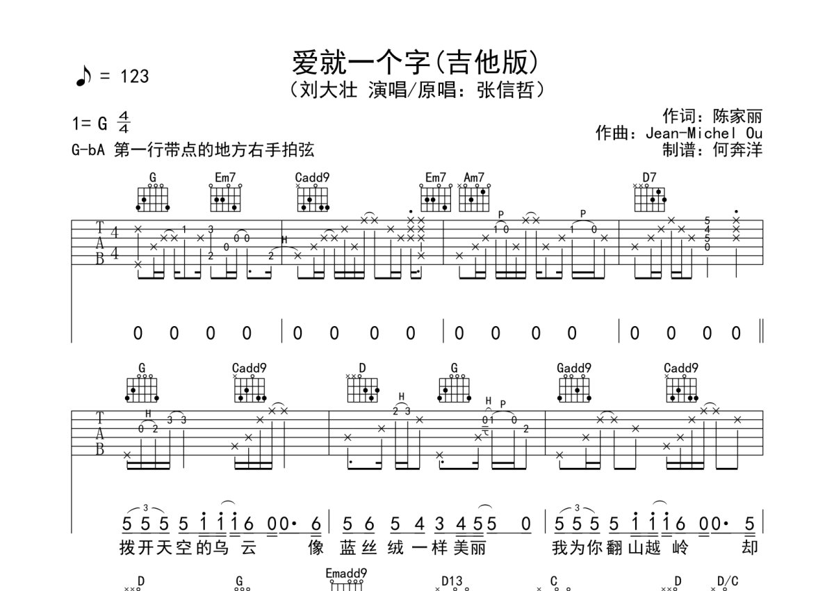 刘大壮《爱就一个字》吉他谱 - G调弹唱六线谱