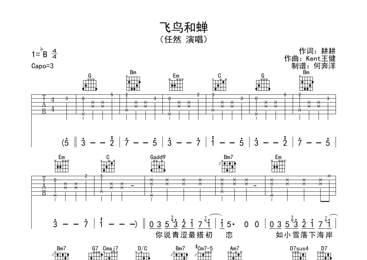 《飞鸟和蝉》是任然演唱的一首歌曲,本吉他谱采用的是G调指法编配,这份吉他谱共有三张高清图谱,图谱由 @何奔洋 编配上传,图谱使用六线谱编配,包含吉他和弦指法、简谱以及歌词部分,使用这份飞鸟和蝉吉他谱,可以让你更加方便地掌握这首歌曲的弹唱技巧,快来尝试吧。任然《飞鸟和蝉》高清吉他谱,按原版记谱编配,有重点有细节,保证歌曲的完整性,不删减小节。