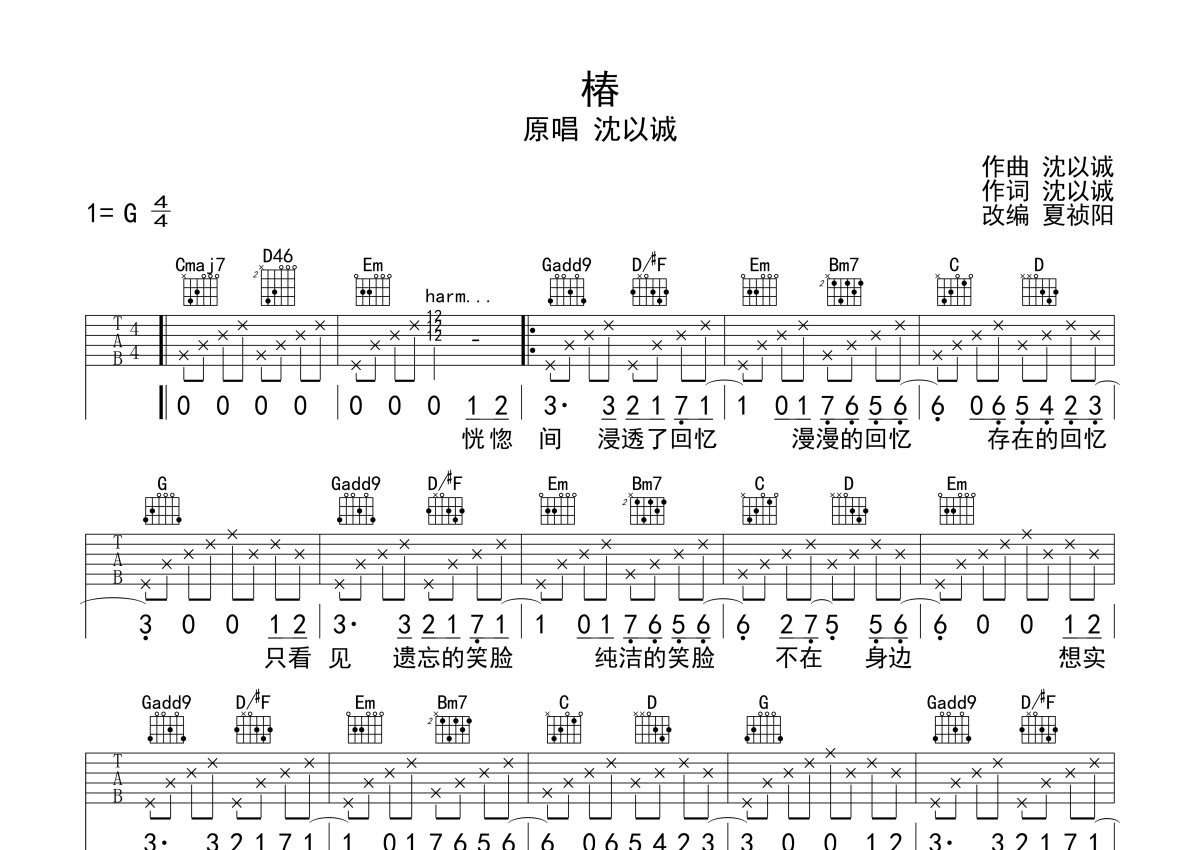 沈以诚《椿》吉他谱 - G调弹唱六线谱