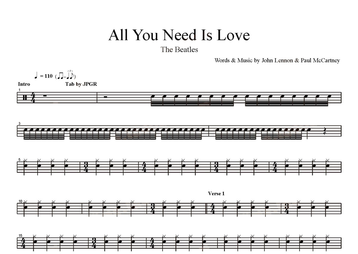 《All You Need Is Love》是Beatles演唱的一首歌曲,这份鼓谱共有两张高清图谱,图谱由 @打鼓谱 编配上传,图谱使用五线谱编配,使用这份All You Need Is Love架子鼓谱,你将能够轻松地敲打出这首Beatles的All You Need Is Love,快来尝试吧。《All You Need Is Love》一歌由John Lennon创作(署名为Lennon-McCartney),由英国摇滚乐队The Beatles在《Our World》(第一个全球卫星直播的电视节目)首次表演。共有26个国家4亿观众收看。节目在1967年6月25日通过卫星播放,BBC委托The Beatles写一首歌在节目中代表英国演出。歌曲于1967年7月7日以《Baby, You're a Rich Man》为B面发行单曲。