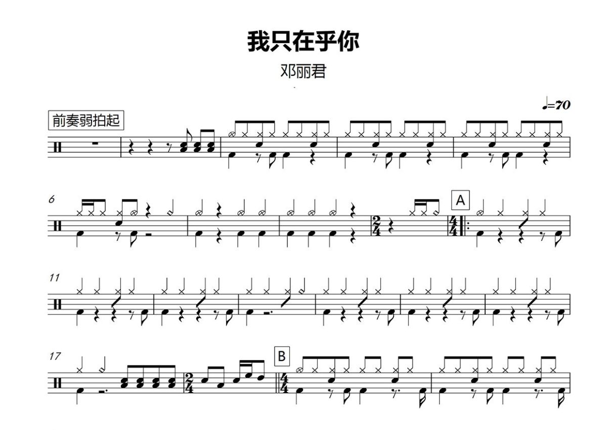 《我只在乎你》是邓丽君演唱的一首歌曲,这份鼓谱共有两张高清图谱,图谱由 @打鼓谱 编配上传,图谱使用五线谱编配,使用这份我只在乎你架子鼓谱,你将能够轻松地敲打出这首邓丽君的我只在乎你,快来尝试吧。《我只在乎你》是邓丽君演唱的一首歌曲,歌曲由三木刚谱曲,慎芝填词,川口真编曲 [1] 。1986年12月28日,该曲以EP形式于日本首次发行。1987年4月1日,该曲被收录在普通话专辑《我只在乎你》中,于香港等地发行。