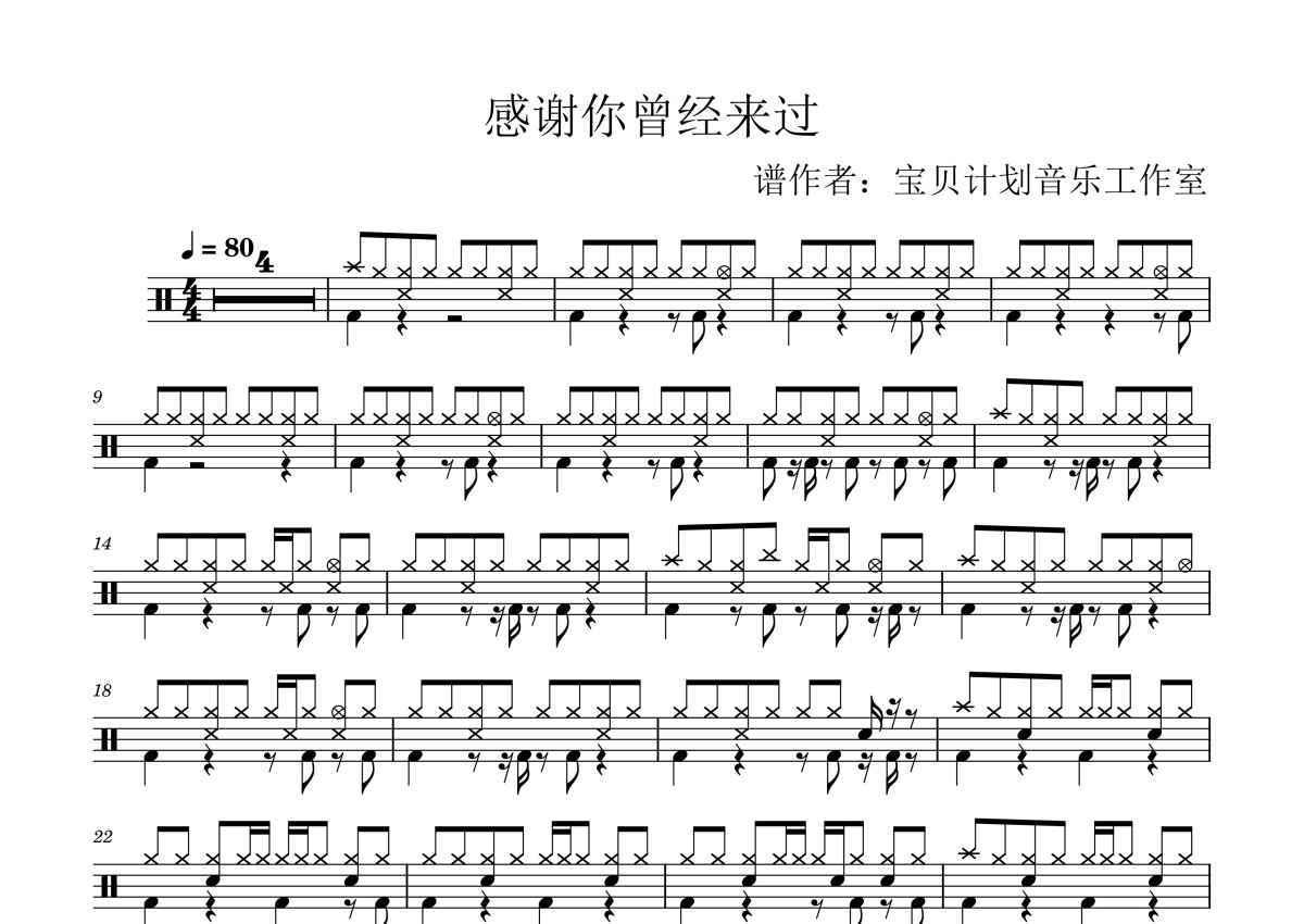 《感谢你曾经来过》是周思涵演唱的一首歌曲,这份鼓谱共有两张高清图谱,图谱由 @打鼓谱 编配上传,图谱使用五线谱编配,使用这份感谢你曾经来过架子鼓谱,你将能够轻松地敲打出这首周思涵的感谢你曾经来过,快来尝试吧。《感谢你曾来过》是由周思涵和Ayo97作词、作曲,阿涵和Ayo97演唱的歌曲,发行于2017年2月12日。
