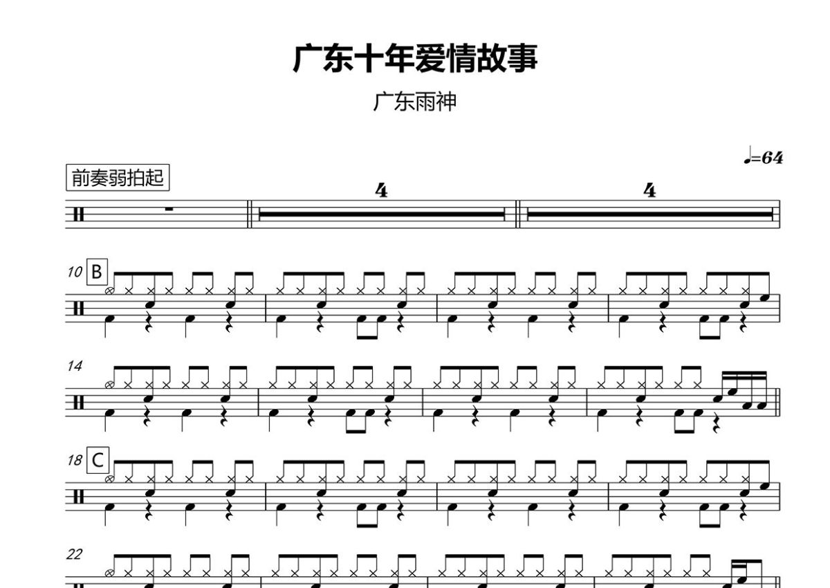 广东雨神《广东十年爱情故事》鼓谱 - 架子鼓谱