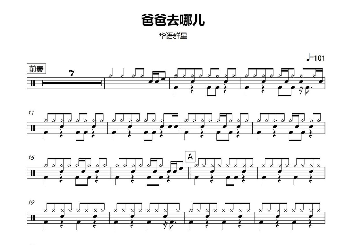 《爸爸去哪儿》是华语群星演唱的一首歌曲,这份鼓谱共有三张高清图谱,图谱由 @打鼓谱 编配上传,图谱使用五线谱编配,使用这份爸爸去哪儿架子鼓谱,你将能够轻松地敲打出这首华语群星的爸爸去哪儿,快来尝试吧。《爸爸去哪儿》是湖南卫视明星亲子生存体验真人秀节目《爸爸去哪儿》的主题曲。歌曲由叶圣涛作曲、吴梦知填词、吕绍淳担任编曲,在2013年10月8日节目首映礼上呈现。