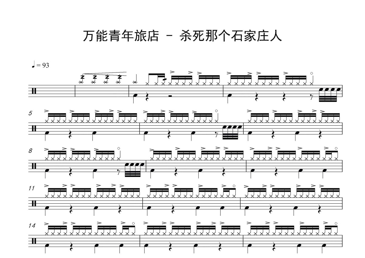 《杀死那个石家庄人》是万能青年旅店演唱的一首歌曲,这份鼓谱共有两张高清图谱,图谱由 @打鼓谱 编配上传,图谱使用五线谱编配,使用这份杀死那个石家庄人架子鼓谱,你将能够轻松地敲打出这首万能青年旅店的杀死那个石家庄人,快来尝试吧。《杀死那个石家庄人》,是万能青年旅店创作并于2010年演唱的歌曲,收录在专辑《万能青年旅店》中。 [1] 这首歌实际上描述了北方重工业城市在经历过了时代变迁,从计划经济到市场经济的变轨所经历的阵痛,和那些被遗忘或者是被抛弃的群体的失落和愤怒的感受。万能青年旅店,中国内地摇滚乐队,由主唱兼吉他手董亚千、贝司手姬赓、小号手史立以及鼓手杨友耕组成。