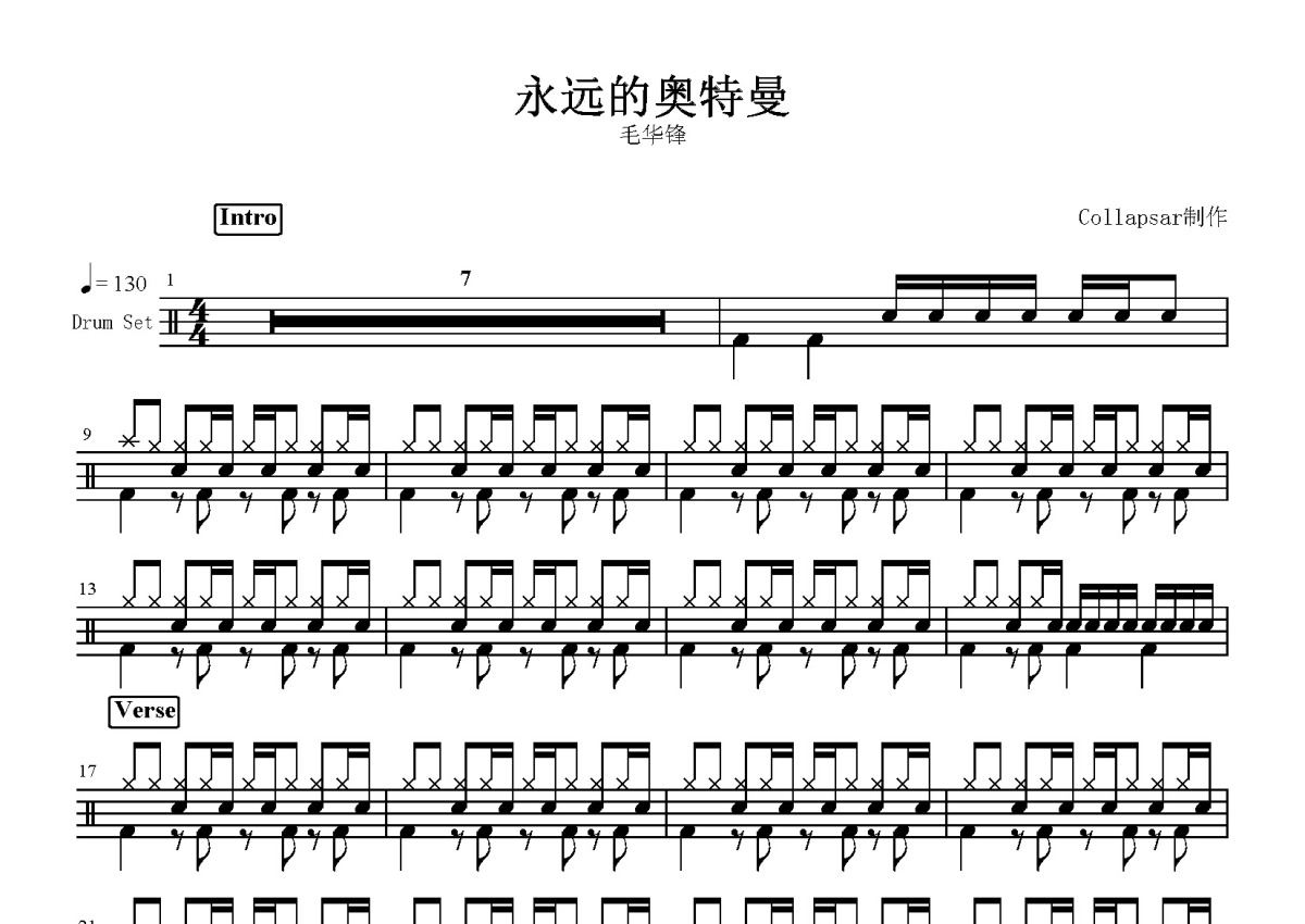 毛华锋《永远的奥特曼》鼓谱 - 架子鼓谱