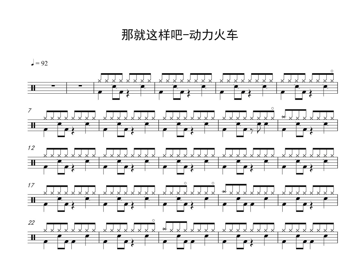 《那就这样吧》是动力火车演唱的一首歌曲,这份鼓谱共有两张高清图谱,图谱由 @打鼓谱 编配上传,图谱使用五线谱编配,使用这份那就这样吧架子鼓谱,你将能够轻松地敲打出这首动力火车的那就这样吧,快来尝试吧。《那就这样吧》是动力火车1999年演唱的一首歌曲,由阿轩作词、作曲,江建民编曲。收录于1999年12月发行的专辑《再见我的爱人》中。动力火车(Power Station),中国台湾流行摇滚演唱组合,成立于1994年,由尤秋兴、颜志琳两位台湾原住民歌手组成。