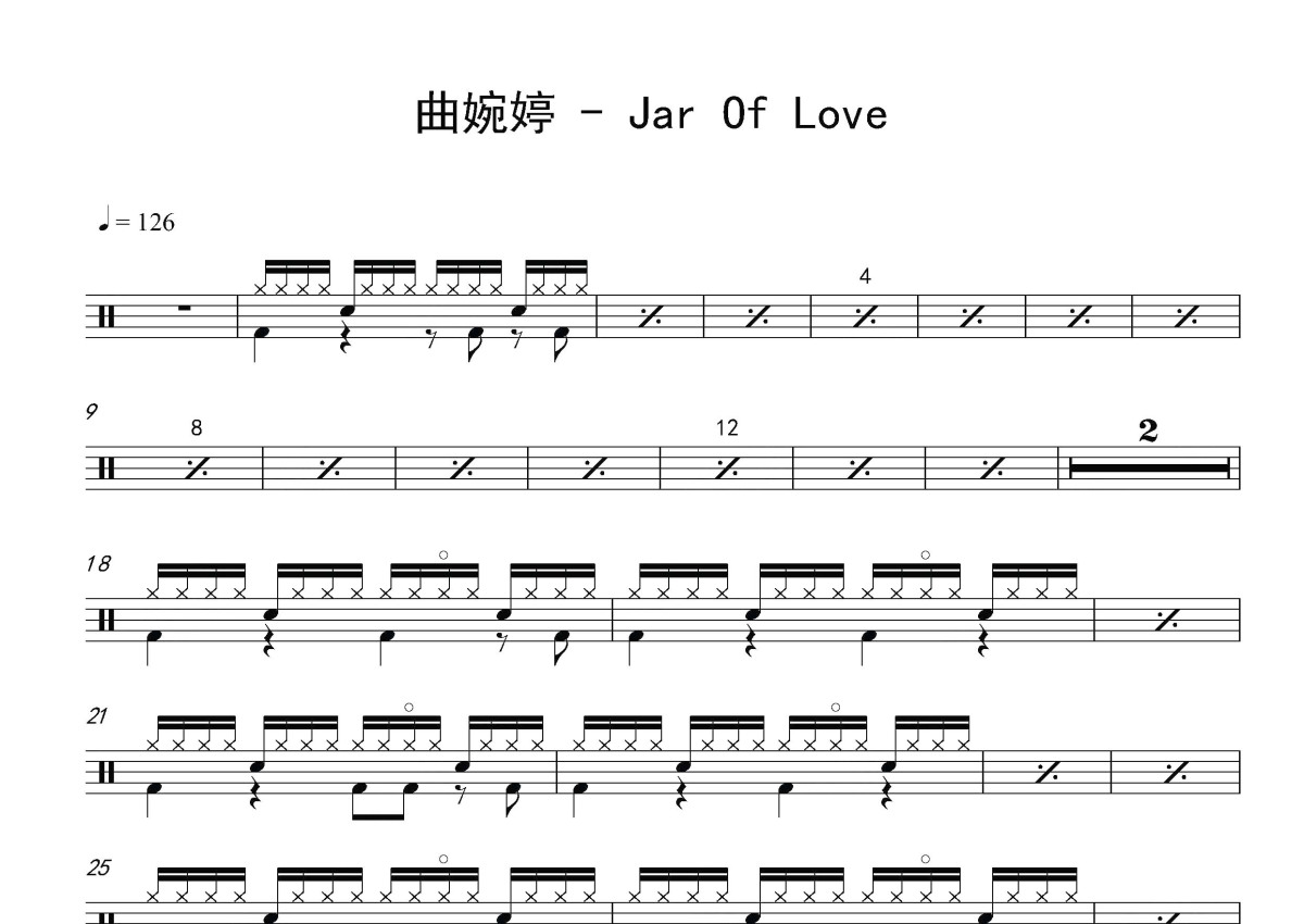 《Jar of Love》是曲婉婷演唱的一首歌曲,这份鼓谱共有两张高清图谱,图谱由 @打鼓谱 编配上传,图谱使用五线谱编配,使用这份Jar of Love架子鼓谱,你将能够轻松地敲打出这首曲婉婷的Jar of Love,快来尝试吧。《Jar of Love》是中国原创音乐人曲婉婷的一首作品,收录在其首张专辑《Everything In The World》(北美版)和《我的歌声里》(亚洲版)中。曲婉婷,1983年10月10日出生于黑龙江省哈尔滨市,中国内地流行乐女歌手、词曲创作人。